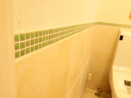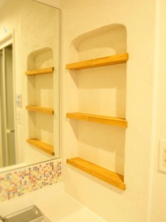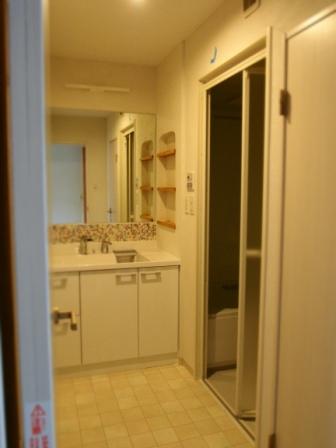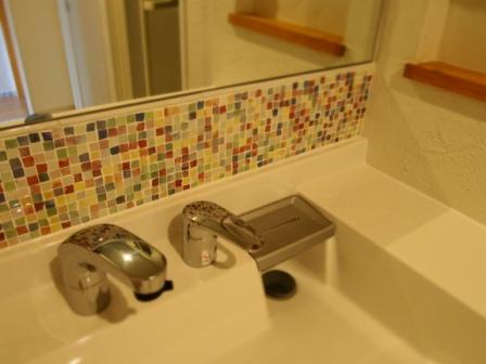 既製品の洗面にモザイクタイルをミラーの下に貼るだけで