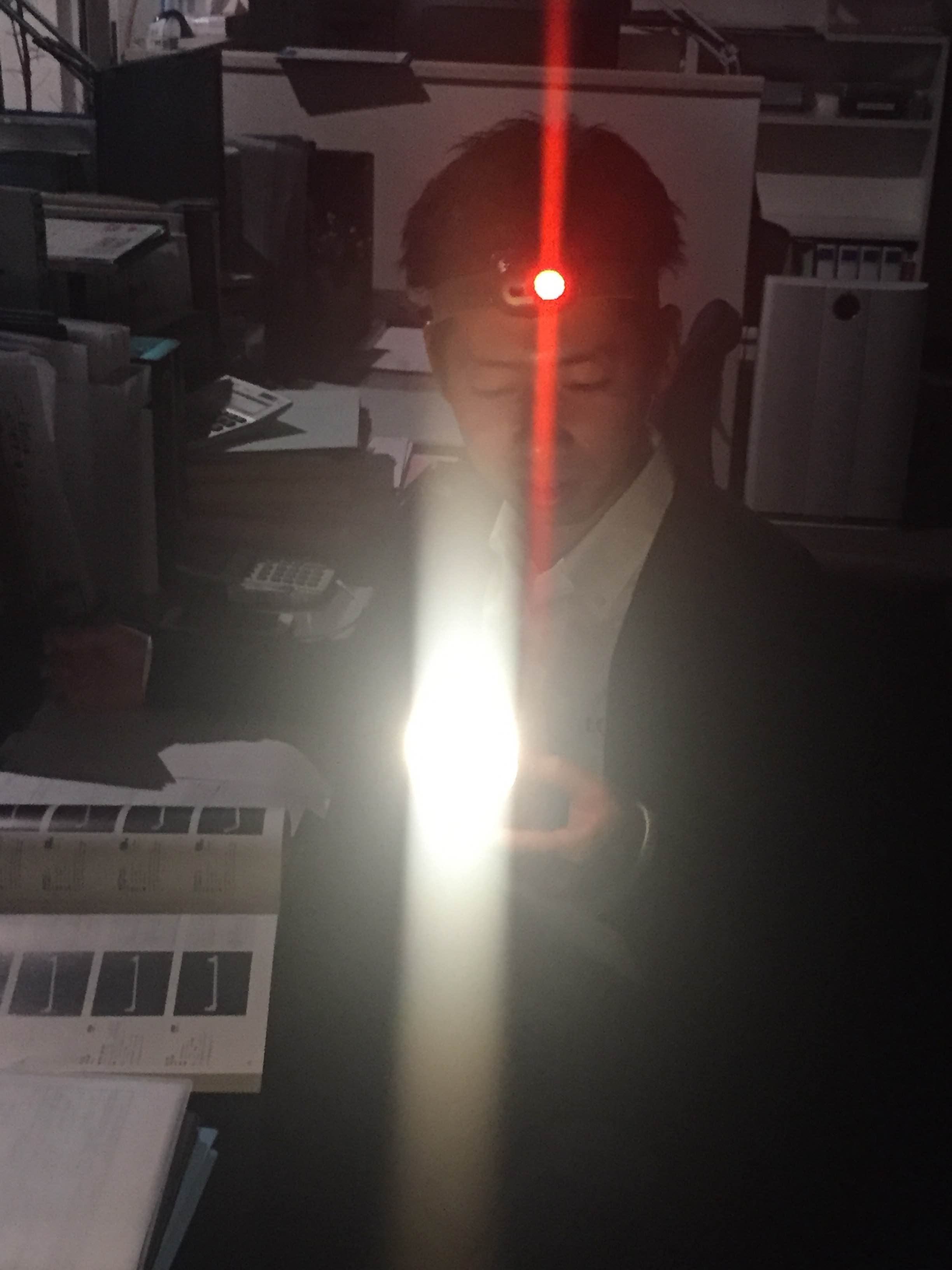 既に停電が始まった真っ暗闇の事務所の中で、ひとり懐中電灯を頭につけてもくもくと仕事に没頭する