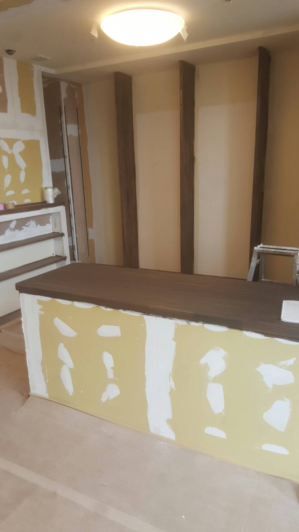 少しさっぱりした既存のカウンターを撤去して、無垢集成材のカウンター材を新規につけました!