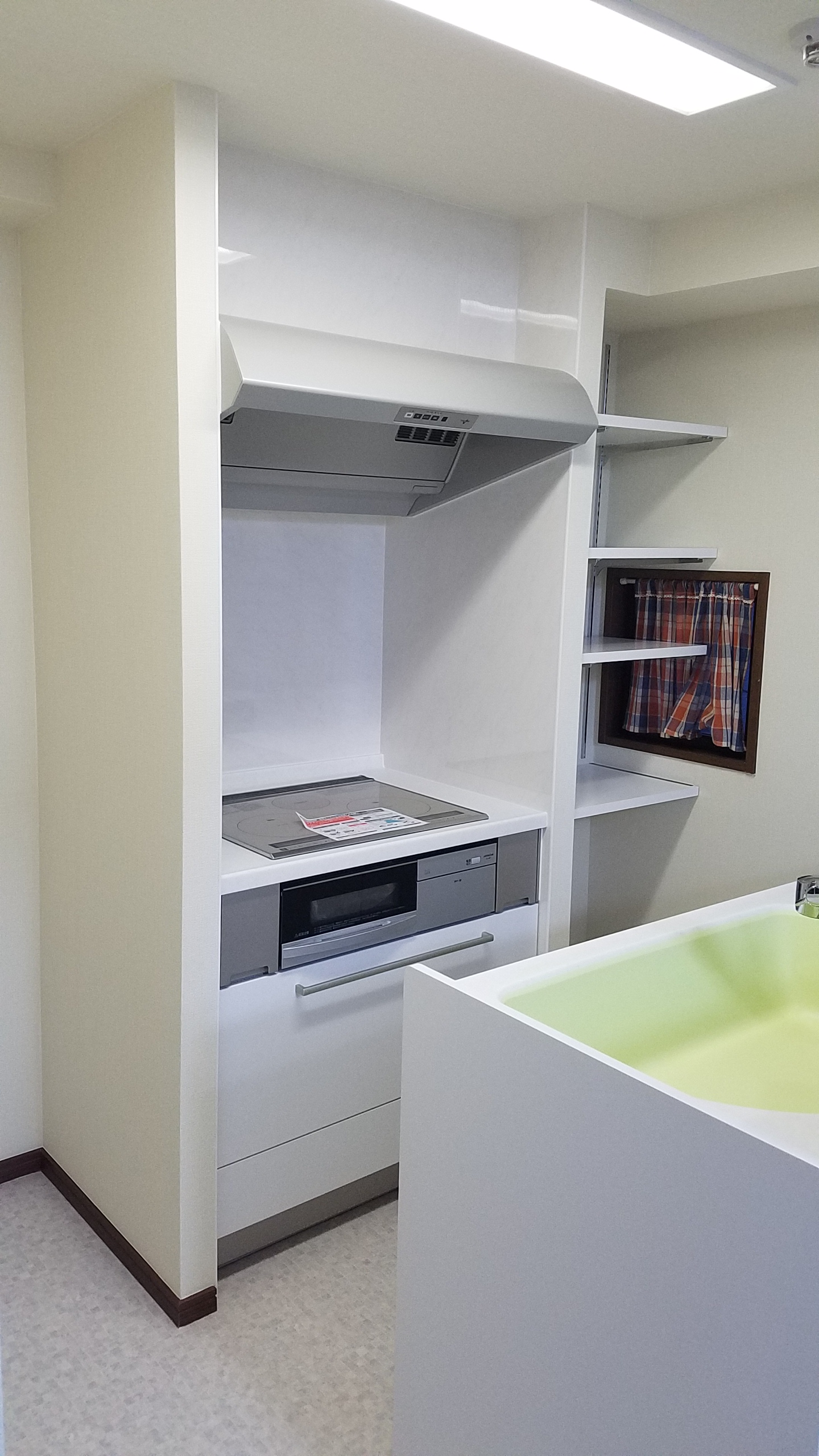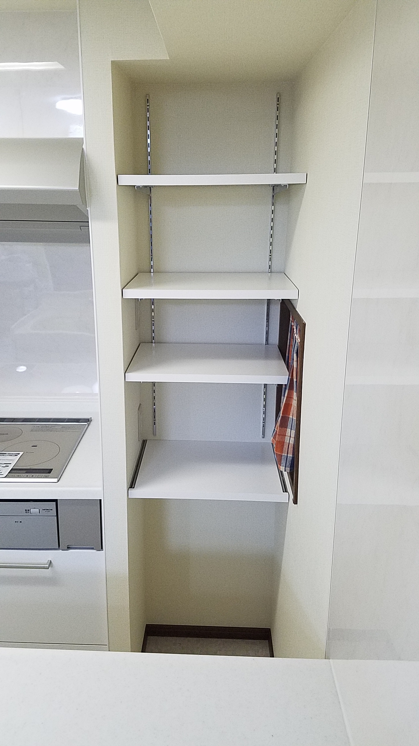 単独で設置したコンロの横にスライド棚と可動棚を取付け、
