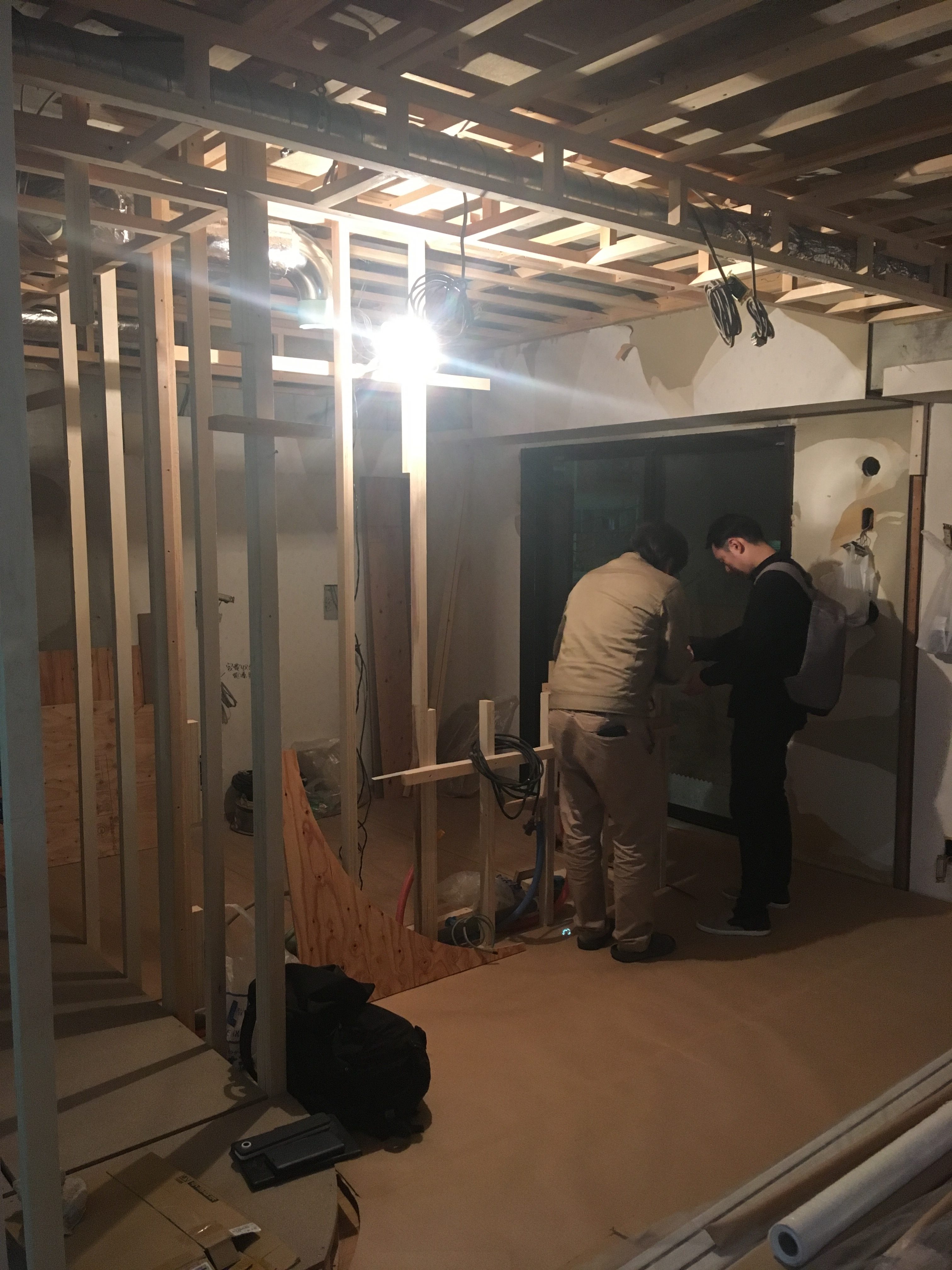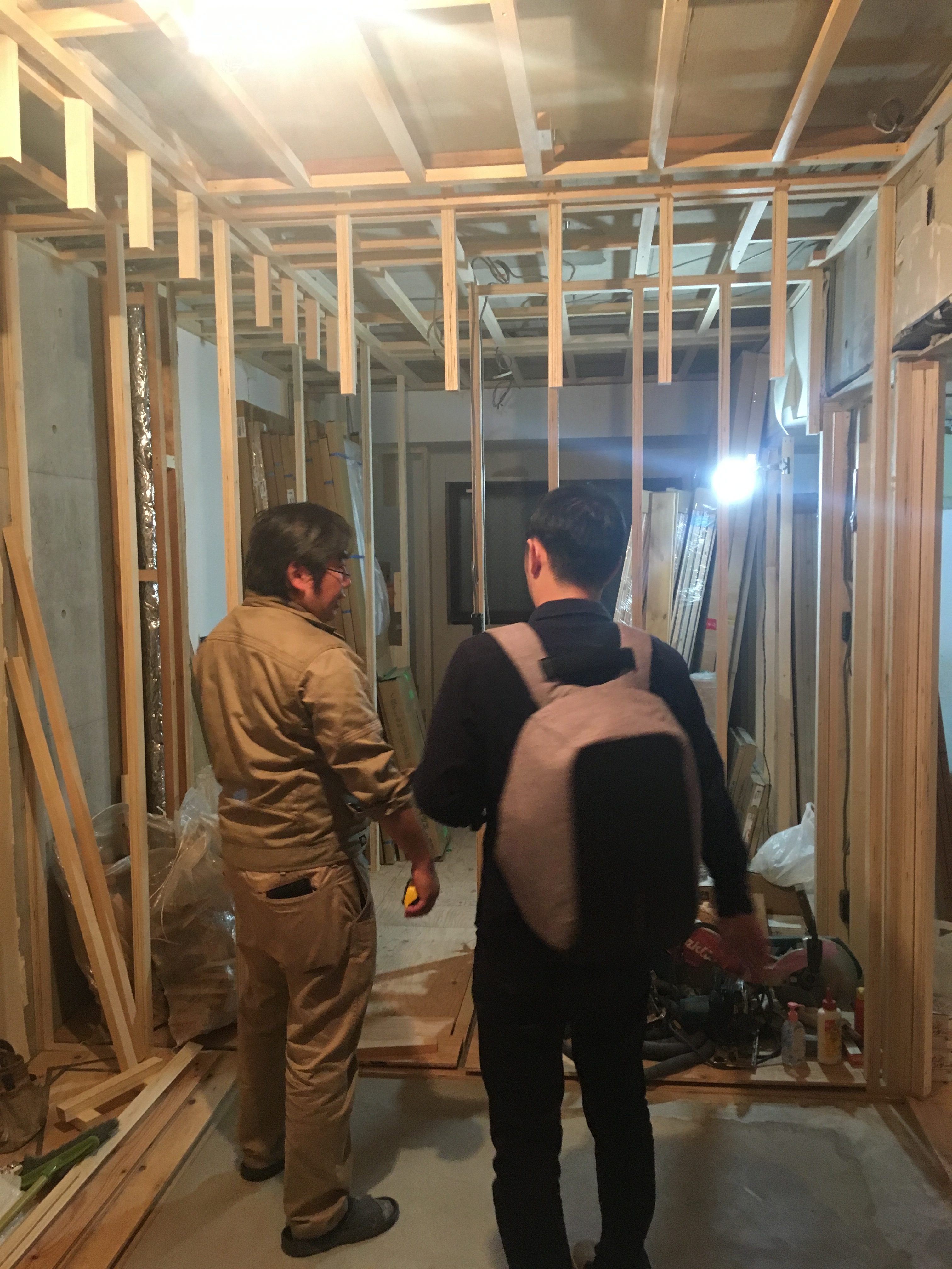 ある程度大工工事が進んでいる途中段階で施工監理とデザイナーが現地で打合せをしています。