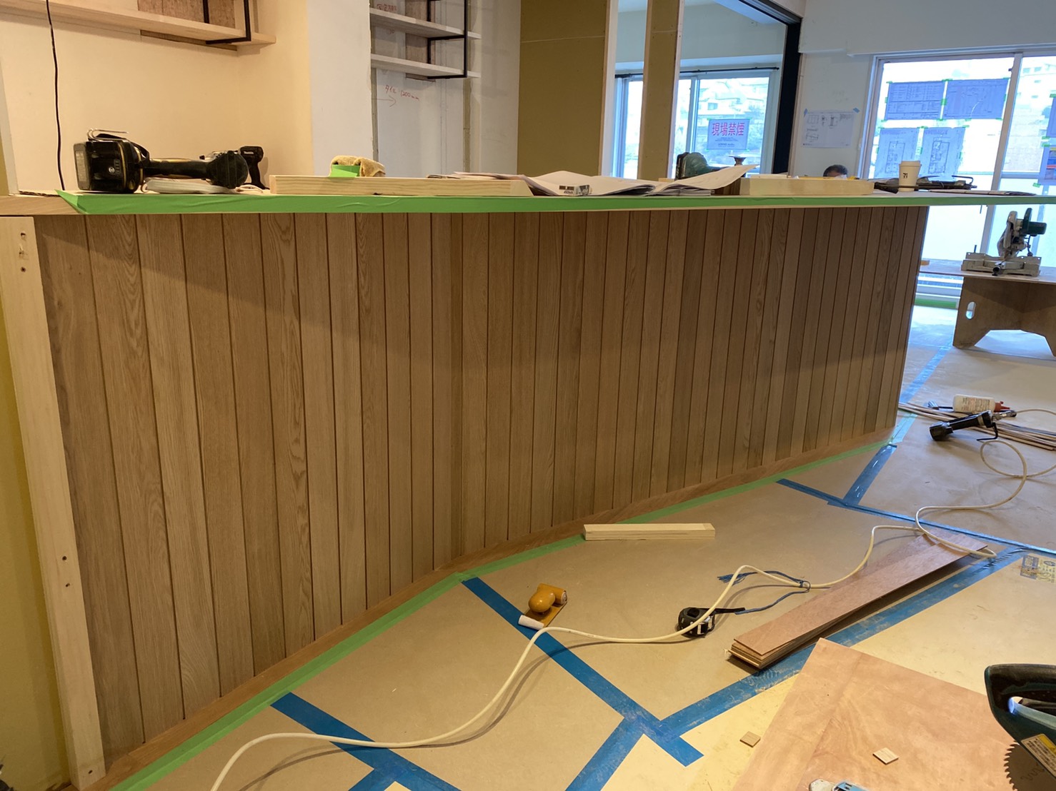デザインにはN様がカフェで出会ったパネリングを足元と天井に計画しこだわり空間に。