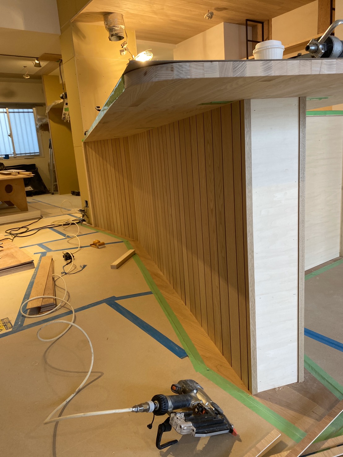 キッチン一体、動線、お家全体の雰囲気などを考慮した結果、キッチンから斜めにせり出す形状に決定しました。