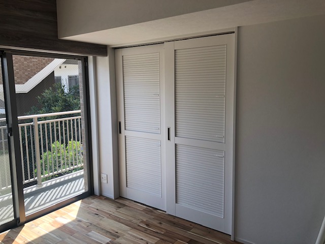 寝室から洗面所へのアクセスとなるドアは施主様の発想でルーバータイプの2枚引戸に。