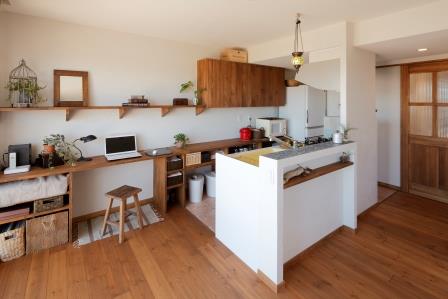 キッチンも向きを変えて、オープンにし、タイルと珪藻土の相性も素敵☆