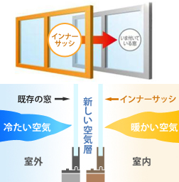 既存のサッシを残しながら、部屋の内側にもう1枚サッシを取り付けるのです!
