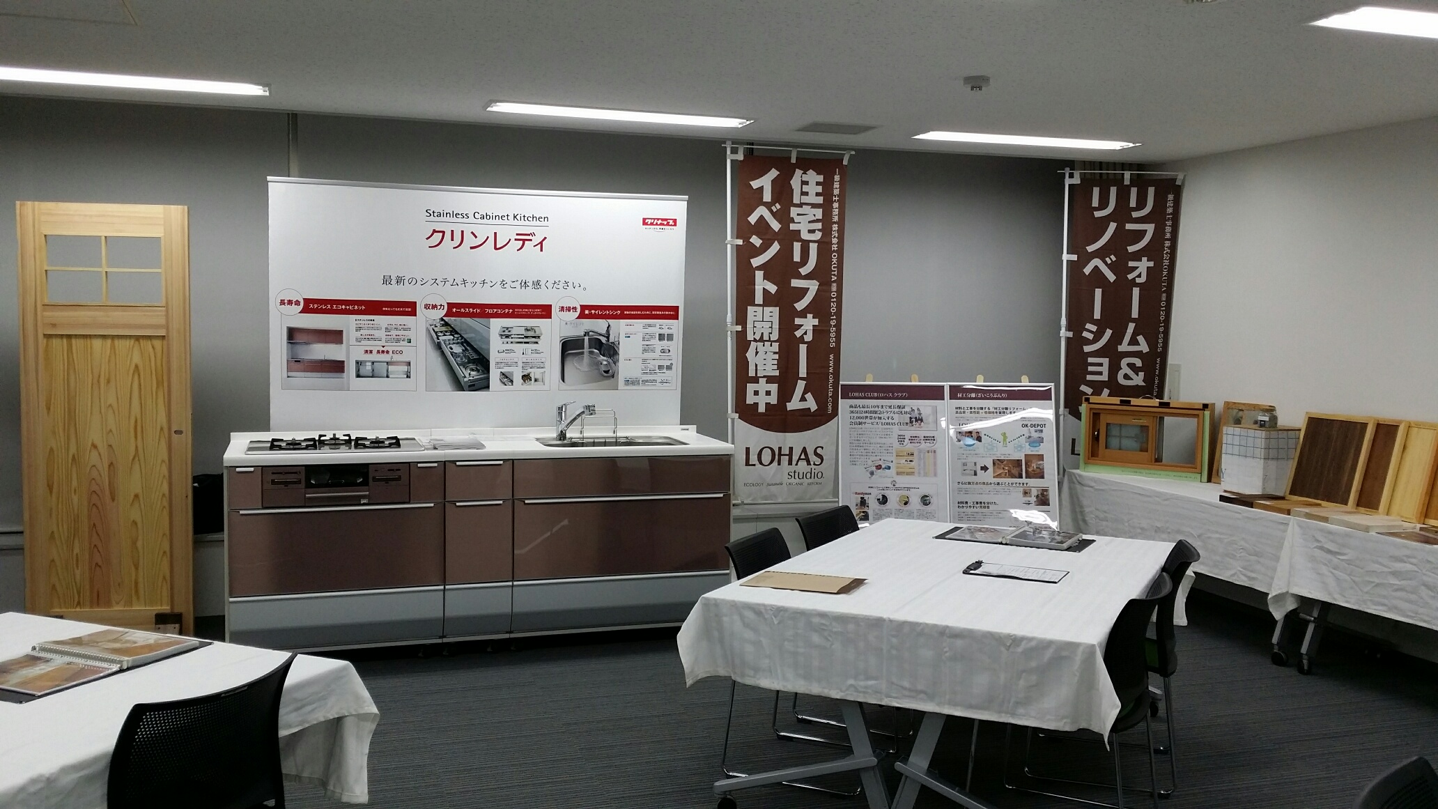 自然素材やシステムキッチン等の展示もありますので、