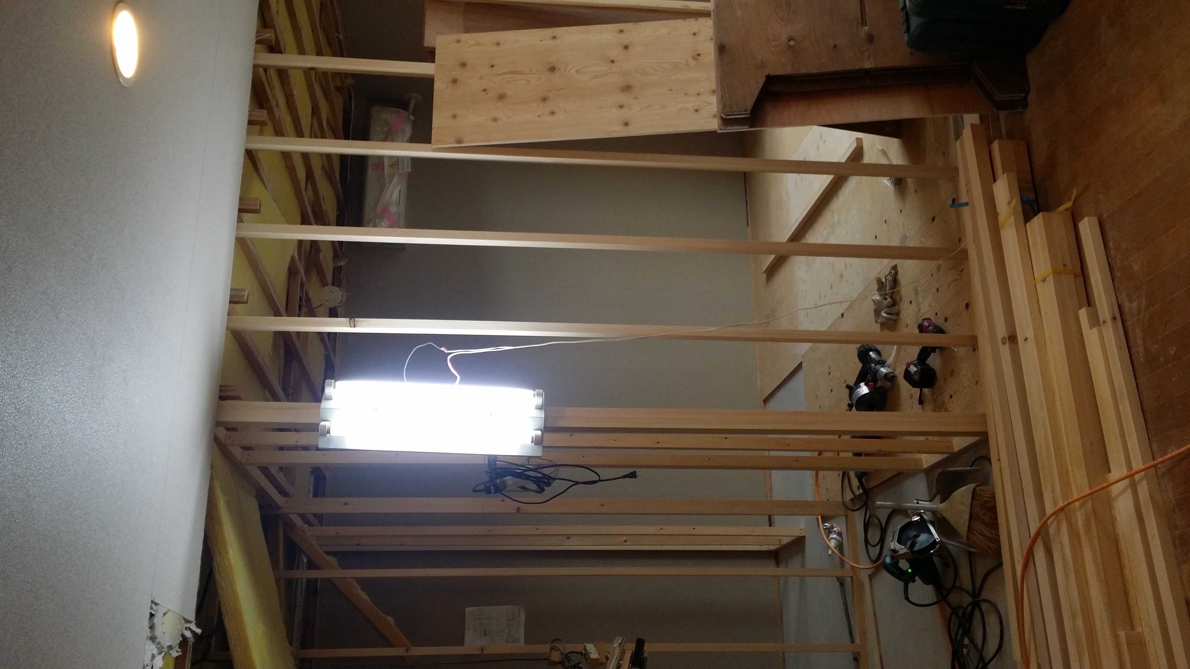 新しく間仕切り壁を造る箇所に大工さんが軸組をしてくれました。 数日後には、下地材(施工ボード等)が貼られて壁が出来上がります。