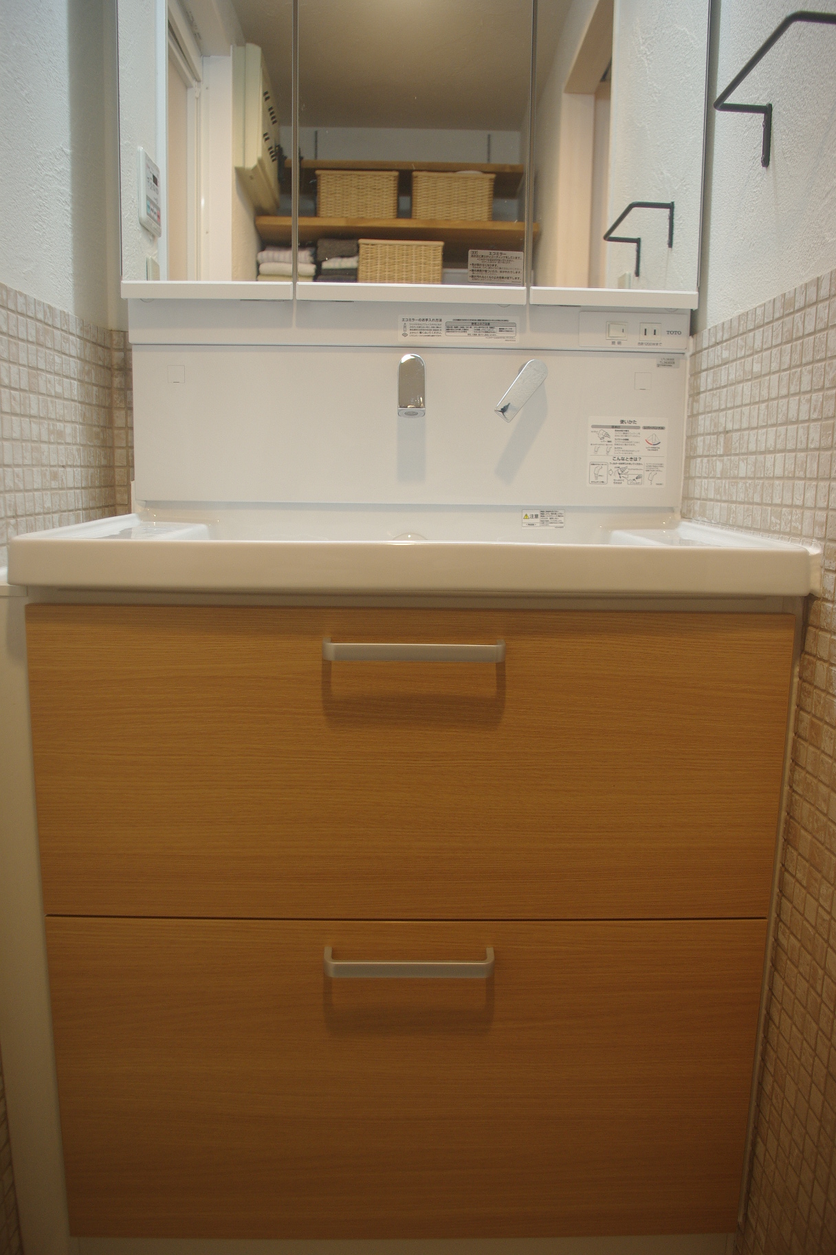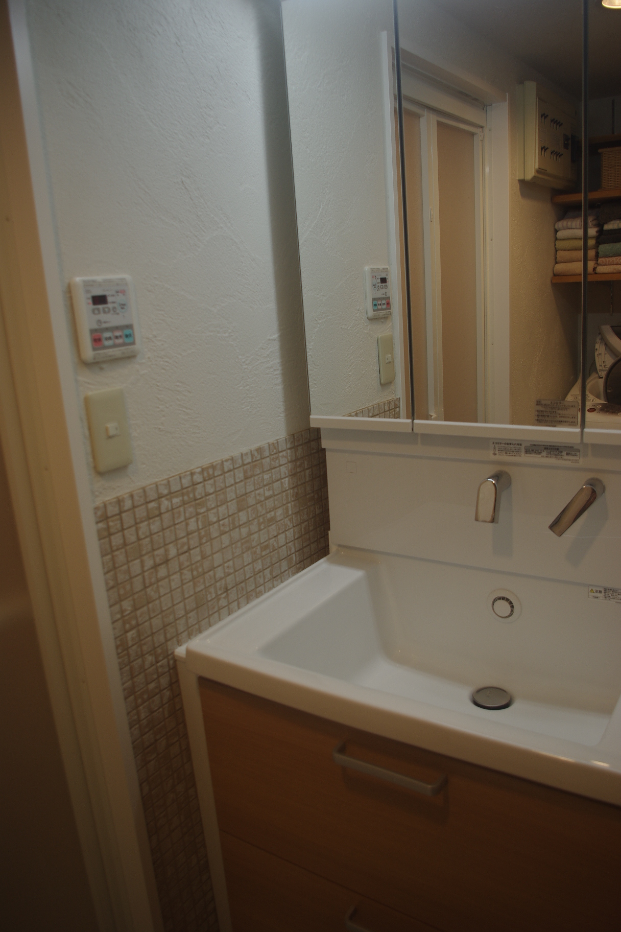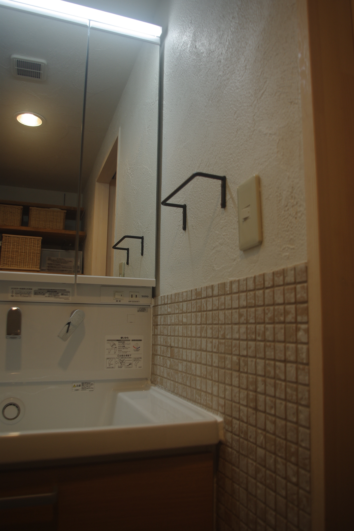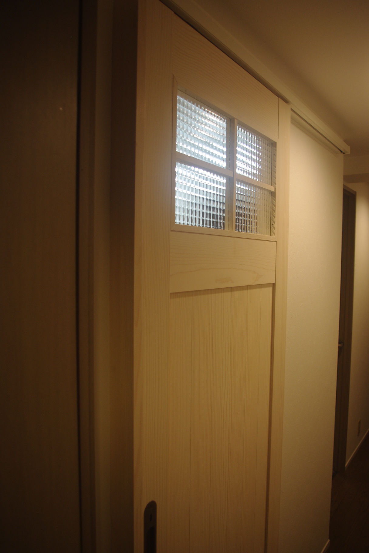 洗面所の入り口は開くと、廊下を塞いでしまうものでしたが、アウトセットタイプの引き戸に変更しました。