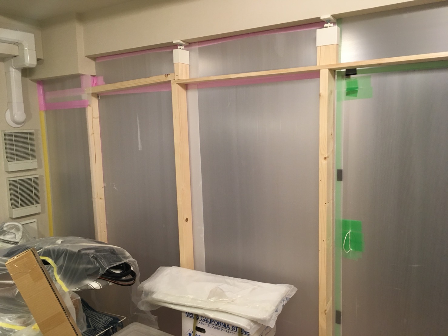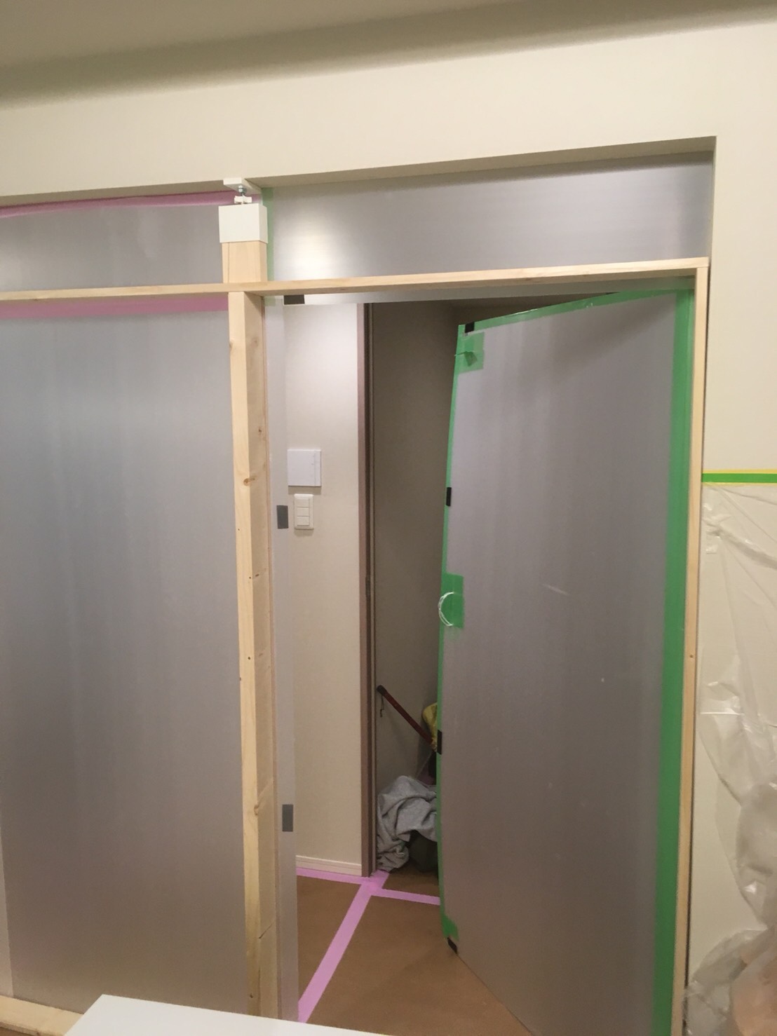 今回はLDKの改装でしたので、埃が住居スペースに舞わないように、LDKに簡易的に壁を作りました。