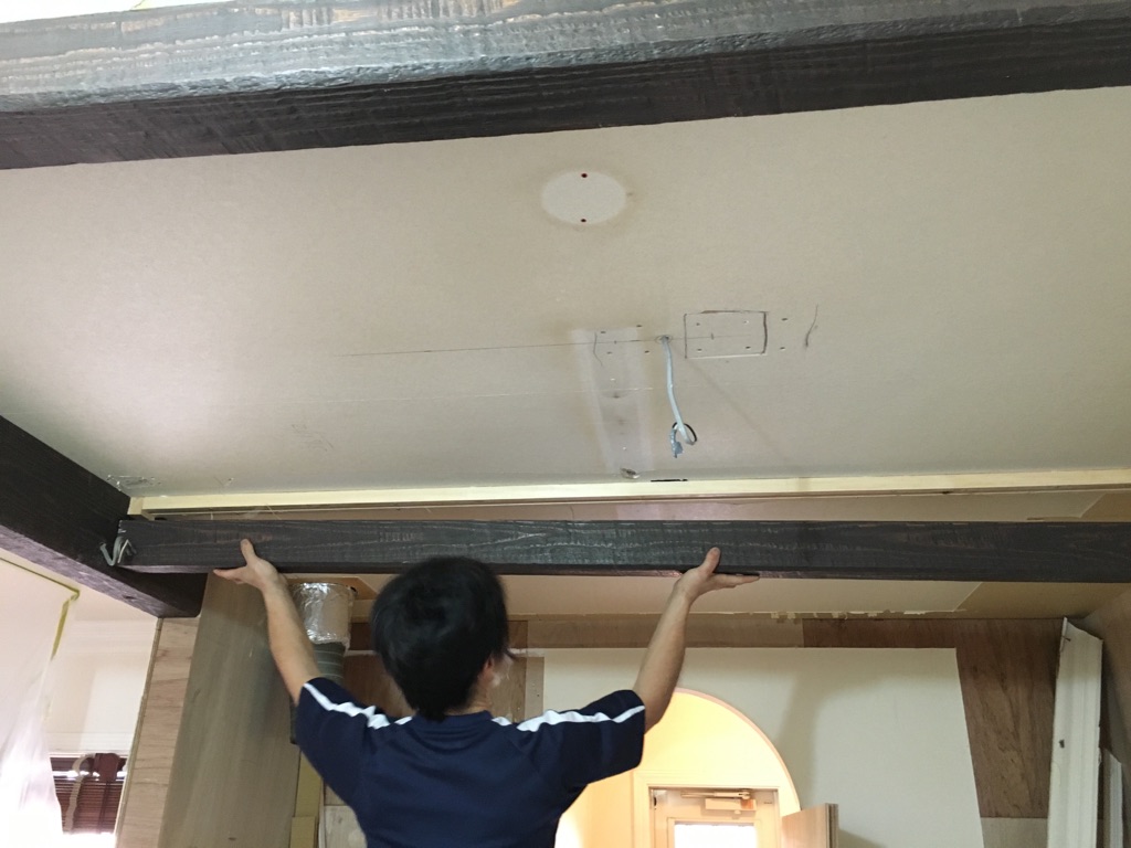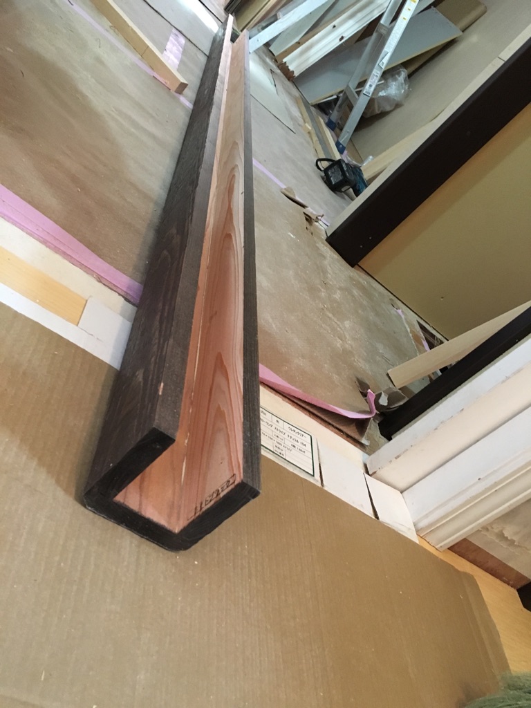 大工さんで、造作梁を設置していました。 中は空洞なので、配線も通せます。 見た目は、古材のようなリアルな質感になってます。 完成版はまた後程・・・