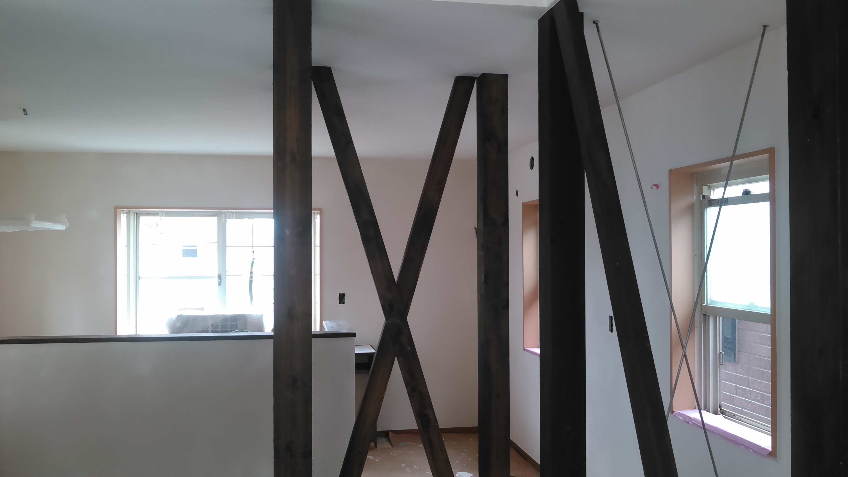 柱と筋交いがむき出しになっており、ロハスオイルのミディアムブラウンで塗装されていました。