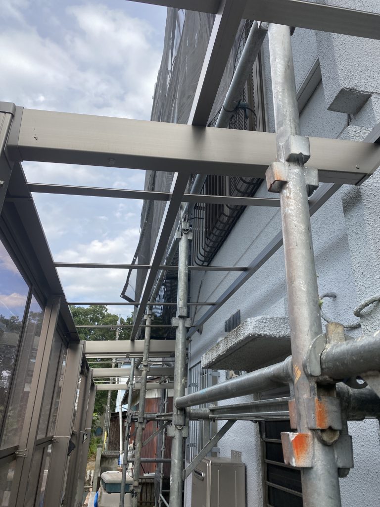 外壁塗装などをする場合は足場をかけますが、家の廻りにカーポートやテラスがある場合はパネルを外さないと足場を組む事が出来ません