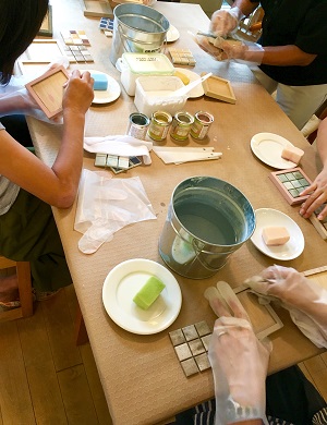 オシャレなタイルとOKUTAの珪藻土・自然塗料・無垢材のナチュラル素材を使ったオリジナルタイルコースターを2枚つくります。
