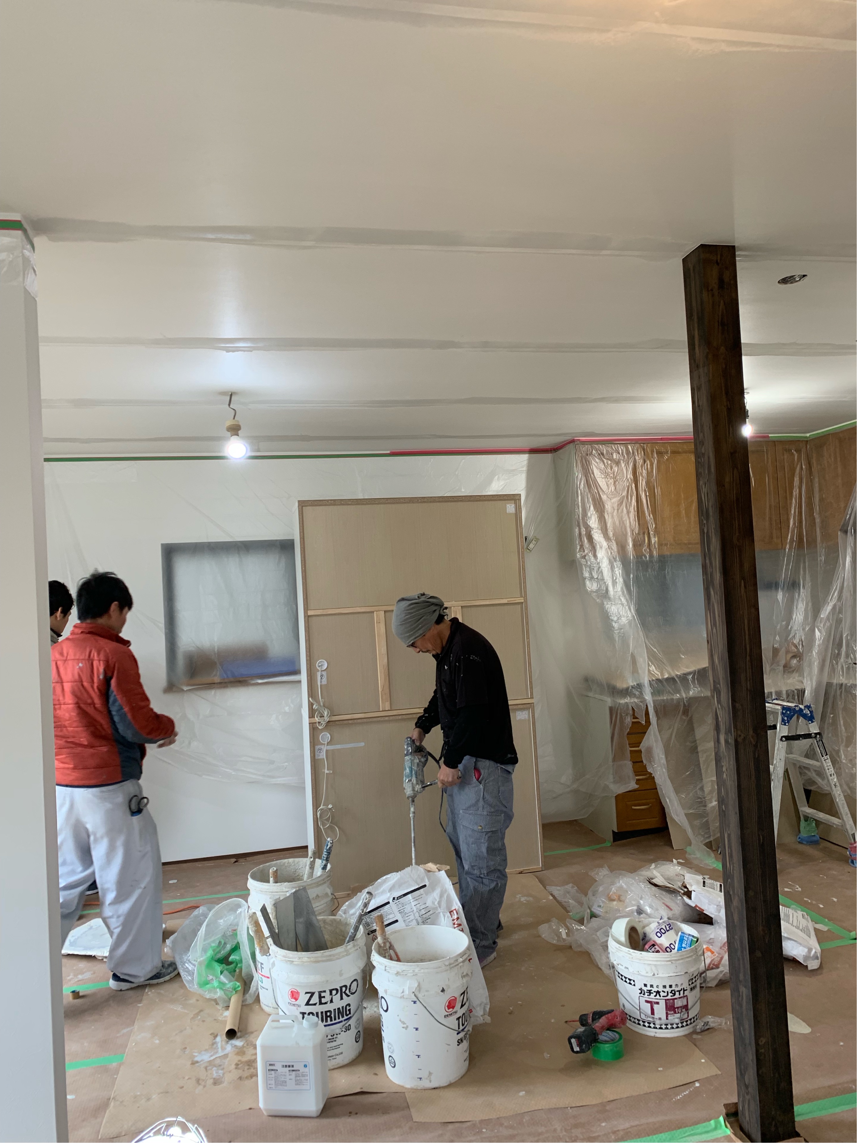 珪藻土を塗るところです♩ 施工当日、お客様と塗りパターンを確認します! こちらは下地クロスを貼った状態。 材料をねりねり…仕上がりをお楽しみに(^^) またご紹介いたします♩
