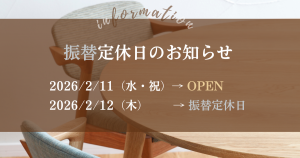 弊社で毎週水曜日を定休日としておりますが、 2月11日(水・祝)は祝日の為、営業(スタジオオープン)いたします。 それに伴い、 翌日2月12日(木)を振替の定休日とさせていただきます。 ご来場を予...