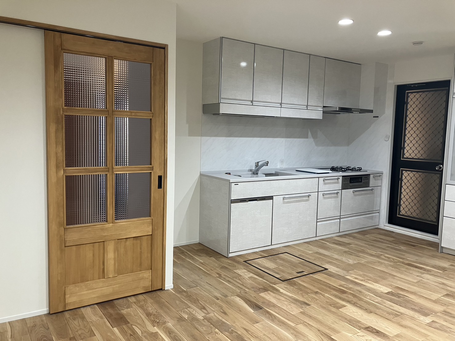 お写真の扉が付いている壁面は、もともと1m程LDK側にあり、少し窮屈に感じられていらっしゃいました。