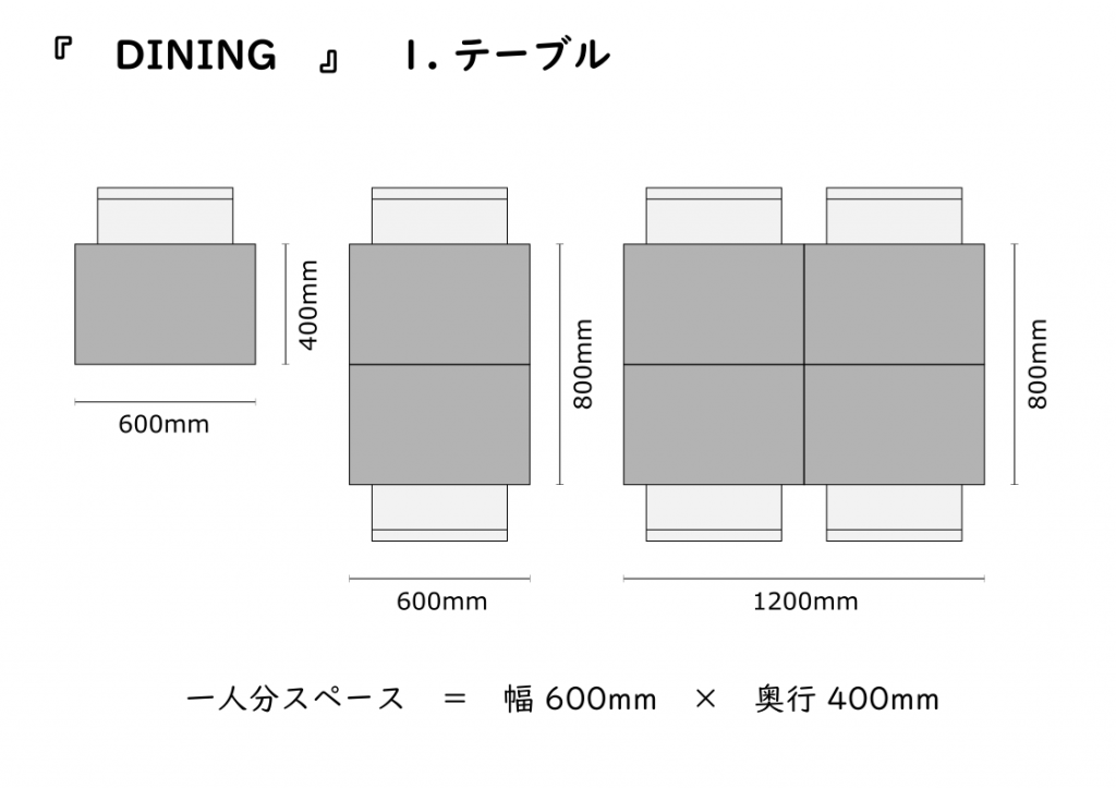 一人分の必要寸法は変わらないのでここだけでも覚えておくことで、手狭なサイズを選んでしまったり、テーブルサイズが余分に大きすぎたりといったことを防ぐことができます!