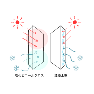 珪藻土の呼吸をするための微細な穴が、夏場のじめじめした時期は湿気を吸い取り、冬場の乾燥時は適度に湿気を放出します。