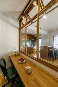 「室内窓」とは異なりますが、パーテーションにガラスを組み合わせも◎