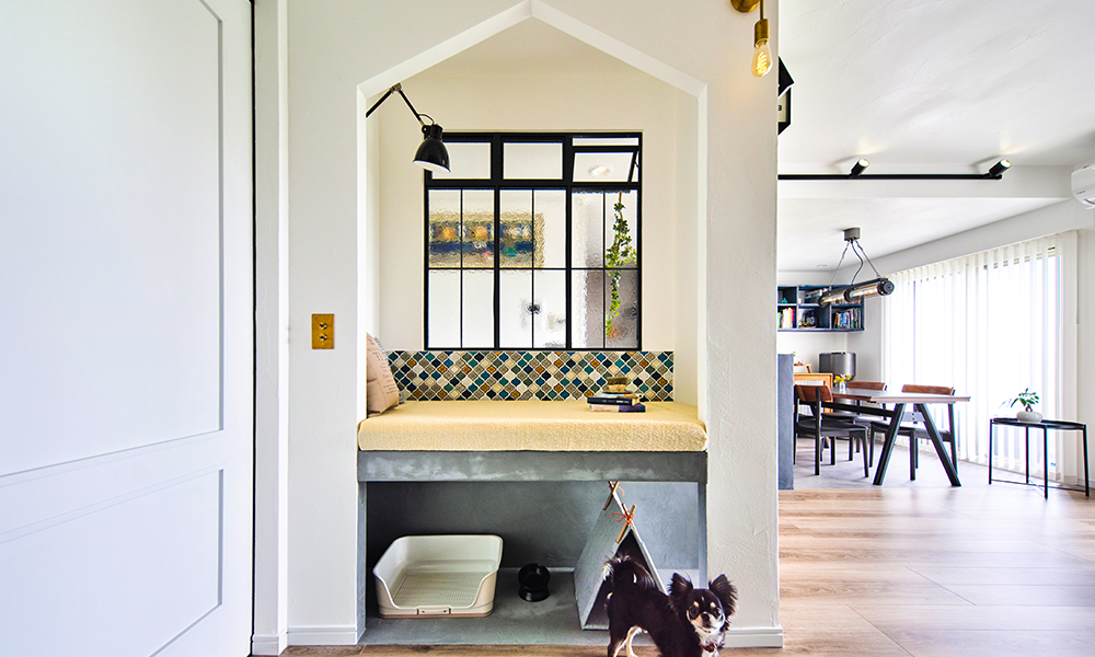 ▼光と視線が抜ける大きなウィンドウや、アクセントのタイル、お気に入りの照明により心地よさを生み出しています。