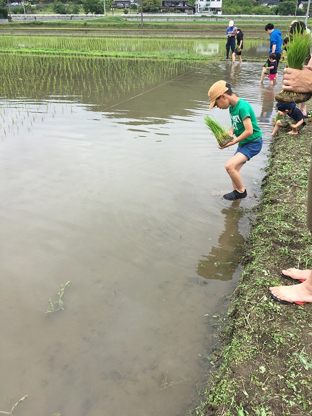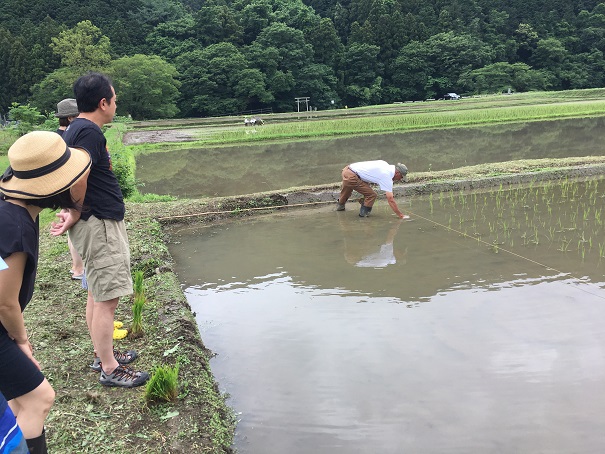 先ずは、田植えの基本動作をレクチャーして貰い、アンバサダーの皆さんにも田んぼに入っていただきます。