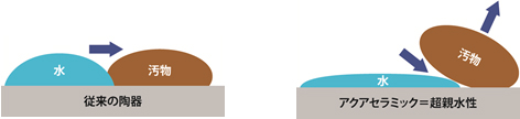 衛生陶器が本来持つ硬さ(キズ防止)や、抗菌の国際規格ISO22196に準拠した抗菌性能を保ちながら、「キズ汚れ」「細菌汚れ」「汚物」「水アカ」の汚れを同時に防ぐ性能をあわせ持つことで4つの汚れすべてに応えることができる世界初の衛生陶器、『アクアセラミック』を新たに開発しました。