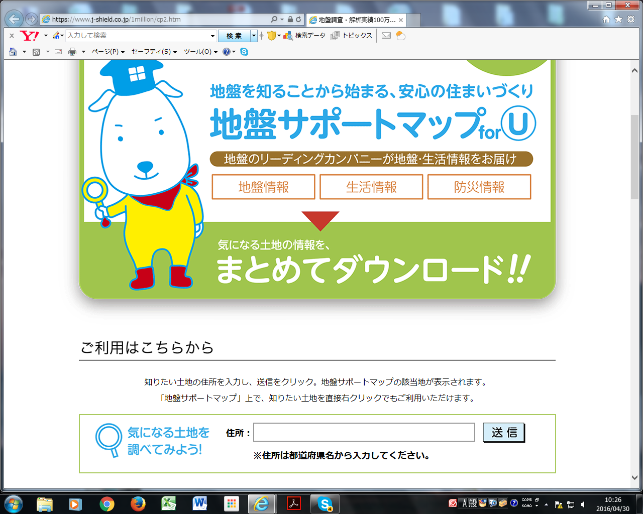 地盤調査の専門会社ジャパンホームシールド社が、調査100万棟突破の感謝キャンペーンとして、地盤サポートマップforUという無料のありがたいサービスを行っています。