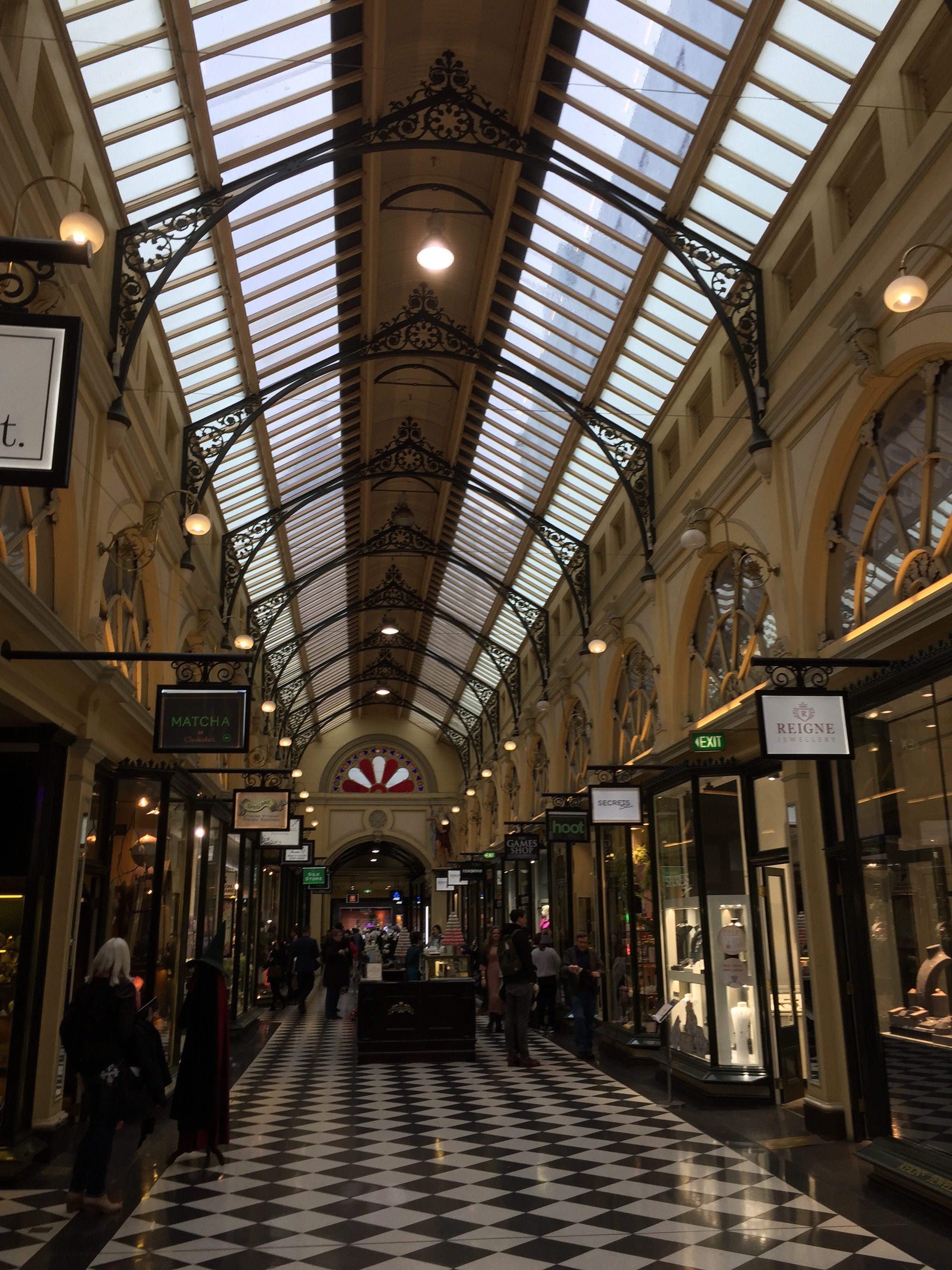 1870年にオープンしたオーストラリア最古のアーケード、ロイヤル・アーケード。今もおしゃれなお店が並んでいました。人気のGaunt’s Clookという時計の両脇にいる人形が鐘を鳴らして、今も時間を知らせてくれていました。