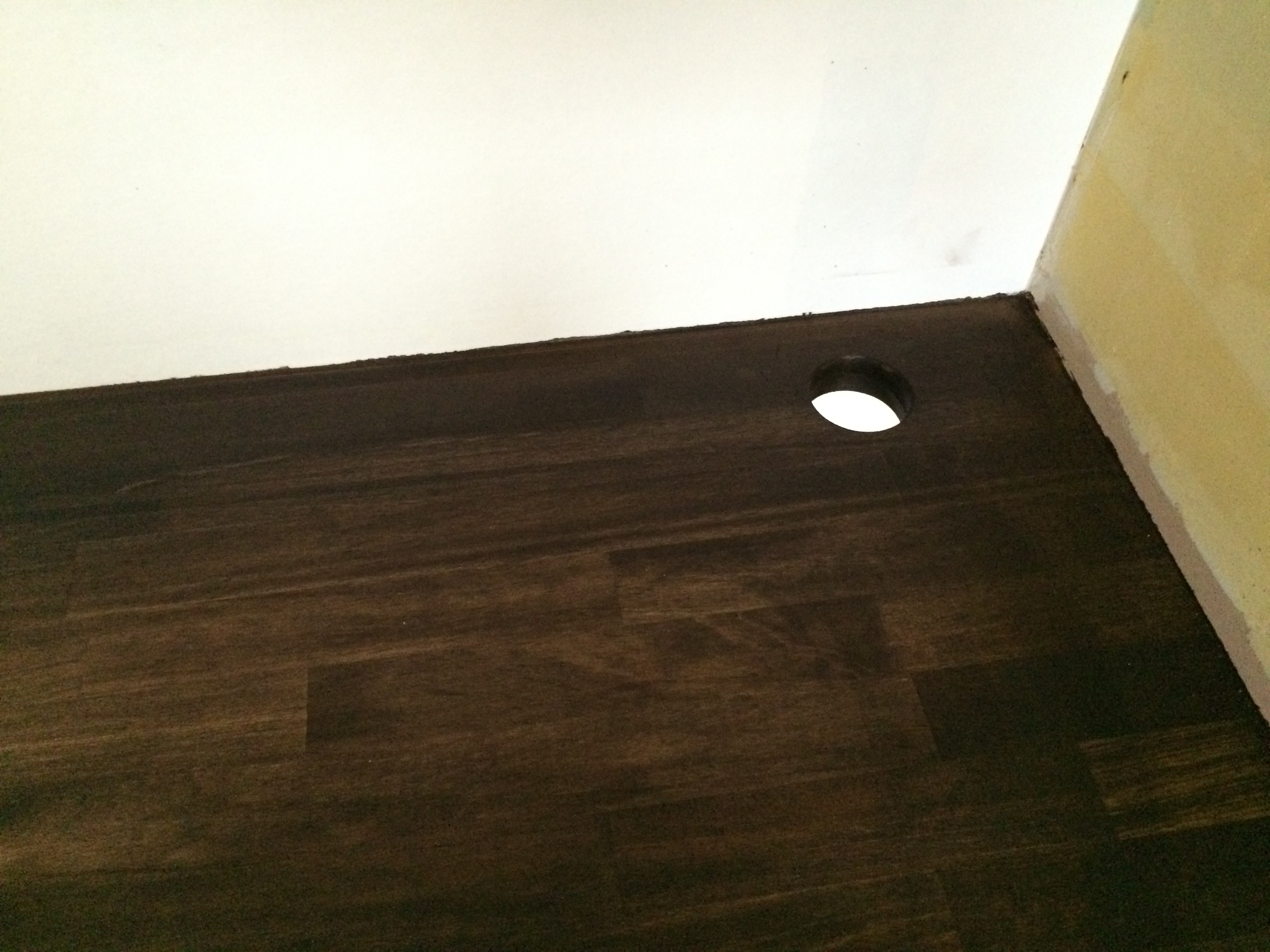 AC線やLAN配線用の穴も加工し、カウンターをすっきりできるのも造作の一つの醍醐味です。