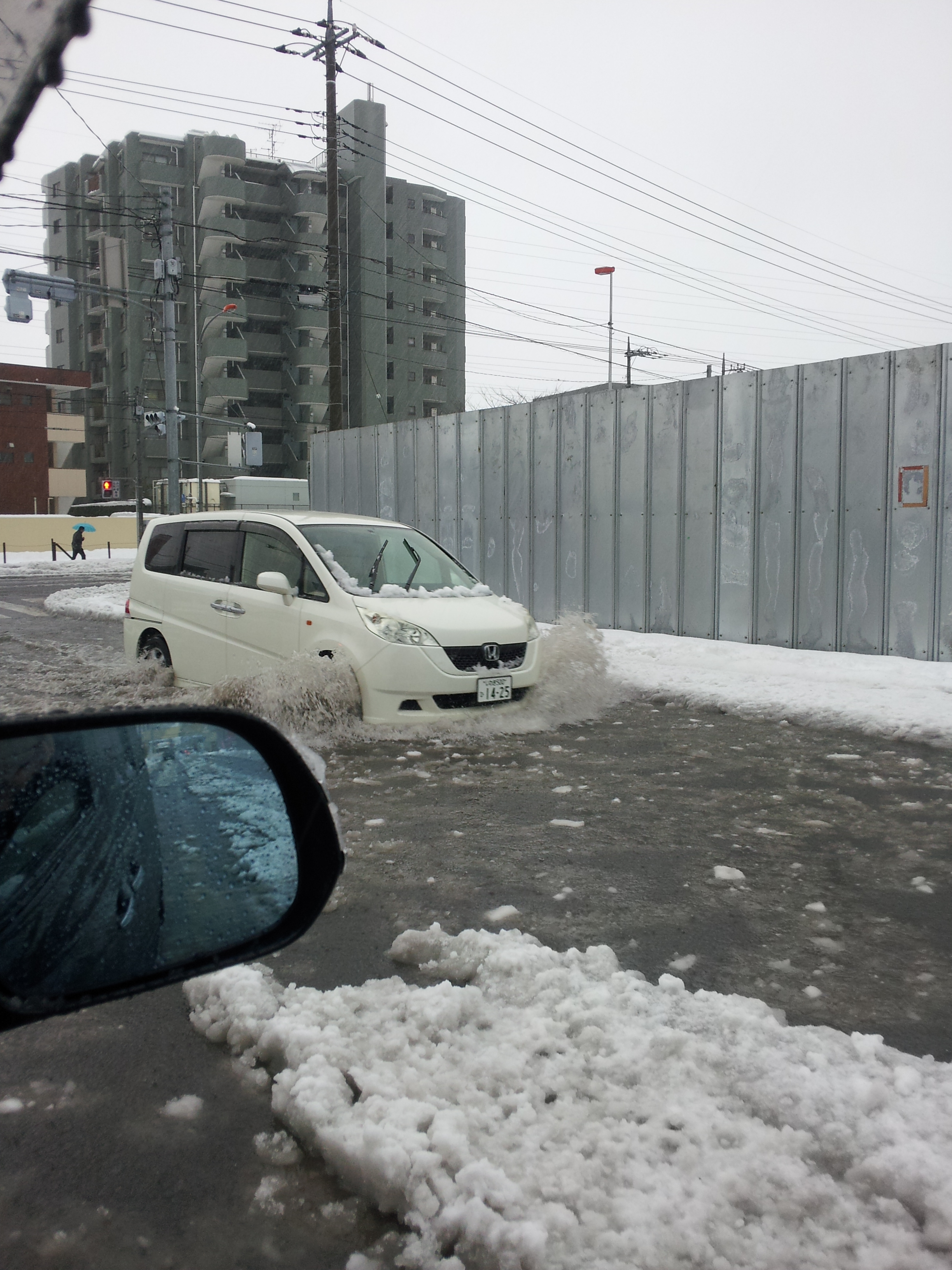 出社する時も、排水溝が雪で詰まっていて、ご覧の様に道路が川になっていました~(T_T)