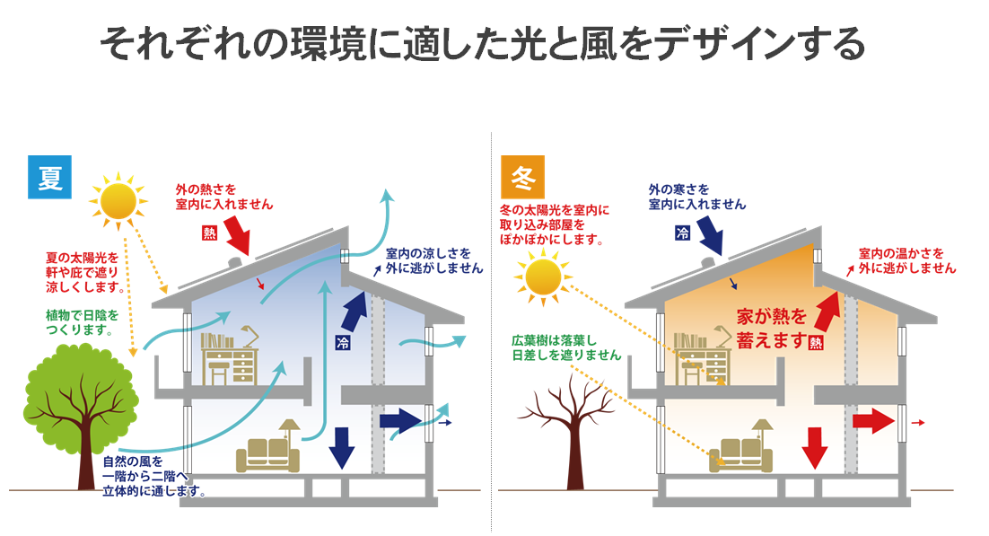 季節ごとに効果的な光を取り入れ、受動的に温度調節をする。
