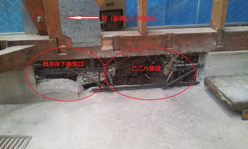 写真のように柱の真下に基礎換気口があると肝心な荷重がうまく分散されず、基礎に局所的に荷重が掛かり、ひどい場合はクラック(ひび割れ)を起こし、大事な役割を果たせなくなります。