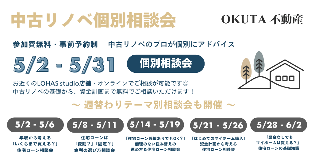【5月OKUTA不動産イベント情報】中古リノベ 個別相談会 ~中古リノベのプロが個別にアドバイス~/参加費無料・予約制(同業者の方ご遠慮ください)