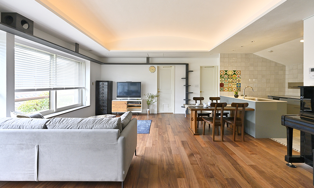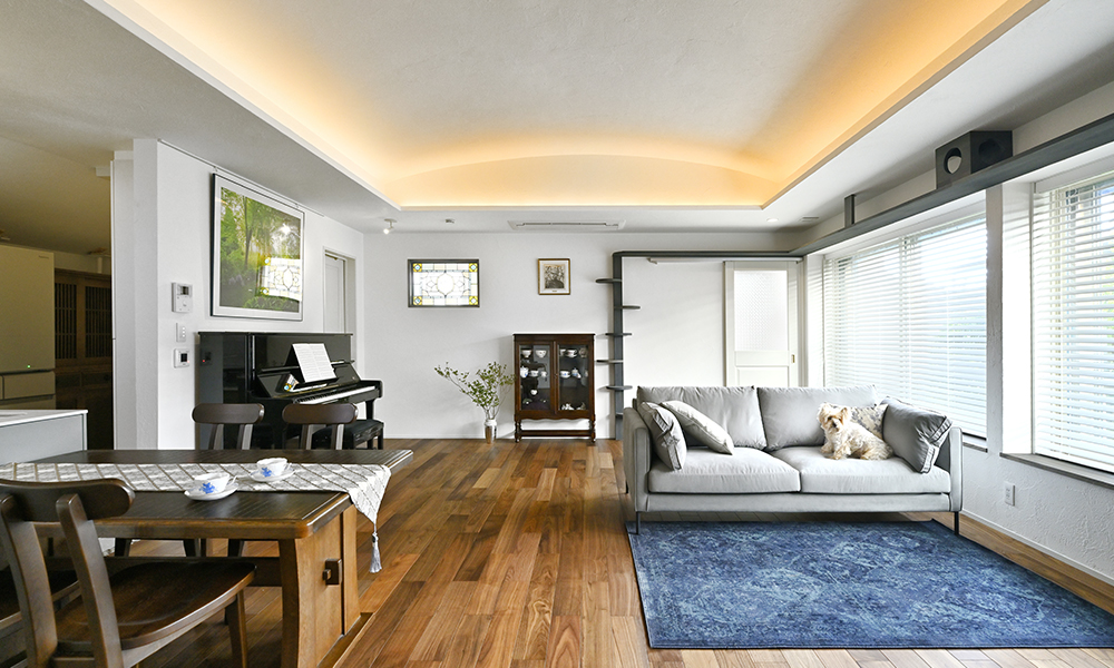 ・無垢フローリング、しっくい、モールテックスを採用した内装
