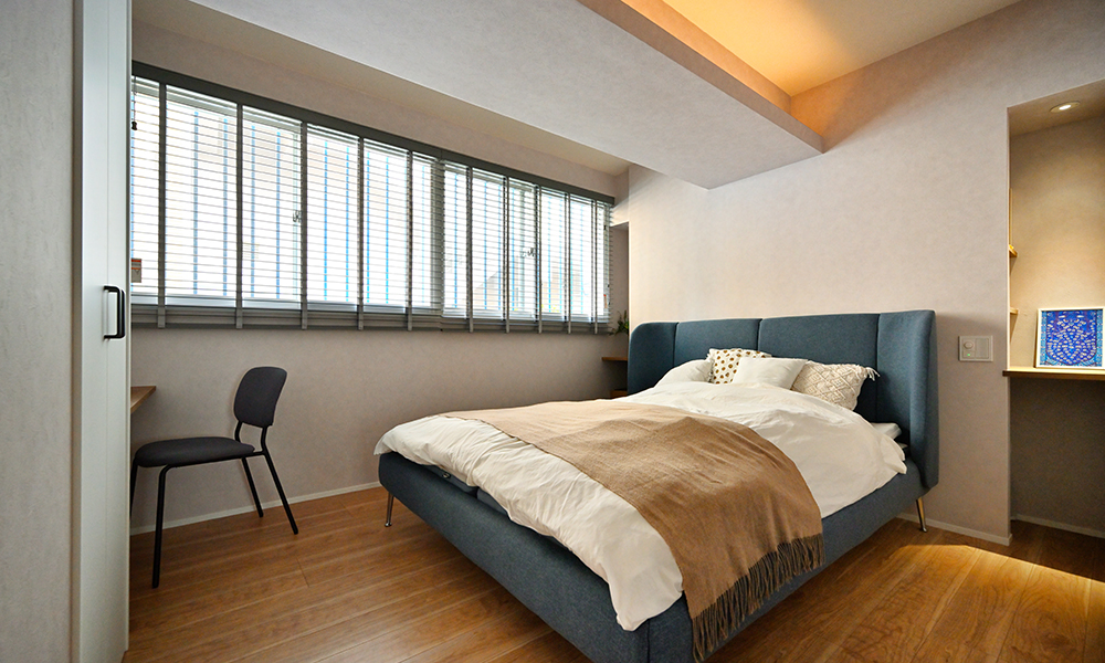 ・マンション特有の柱や梁を利用した”ベッドヘッド収納”と"間接照明"