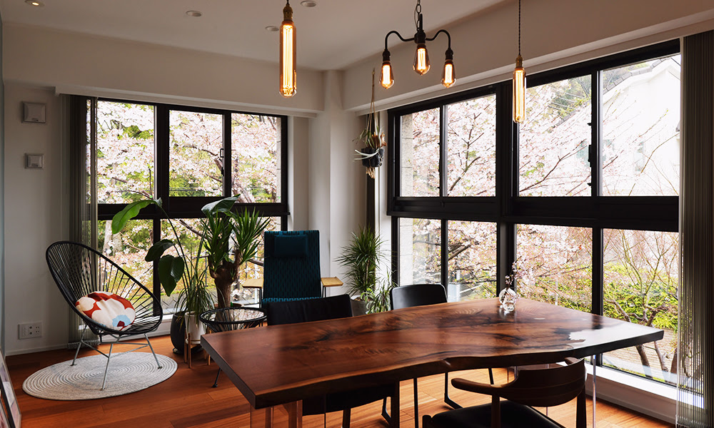 桜が眺める景観を活かし、お二人のご趣味でもあるアートが楽しめる、美術館のような落ち着いた空間に!