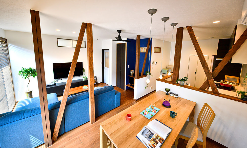 柱や筋交いなどの構造体は現しにして活かしています。外壁も大きく変化し、内外共にリノベーションを行った実例のご紹介です。