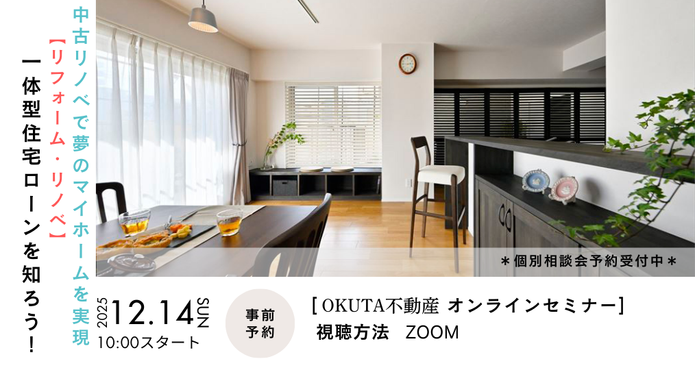 12/14【OKUTA不動産オンラインセミナー】中古リノベで夢のマイホームを実現【リフォーム・リノベ】一体型住宅ローンを知ろう!/参加費無料・予約制(同業者の方ご遠慮ください)