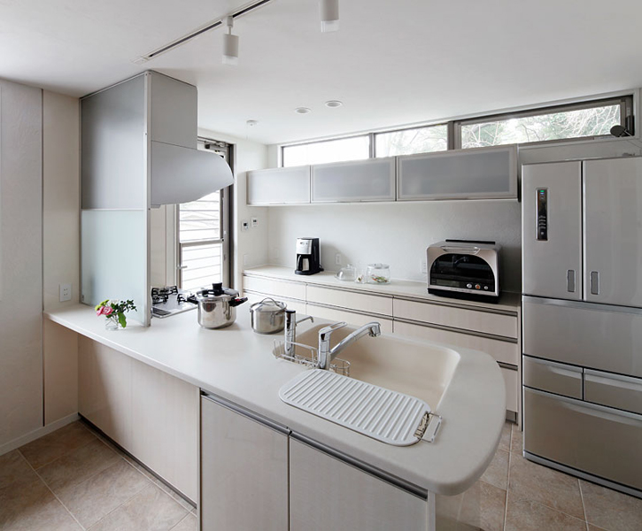 周囲が住宅に囲まれているため、大きい引違窓は可動式ルーバーを採用しました。