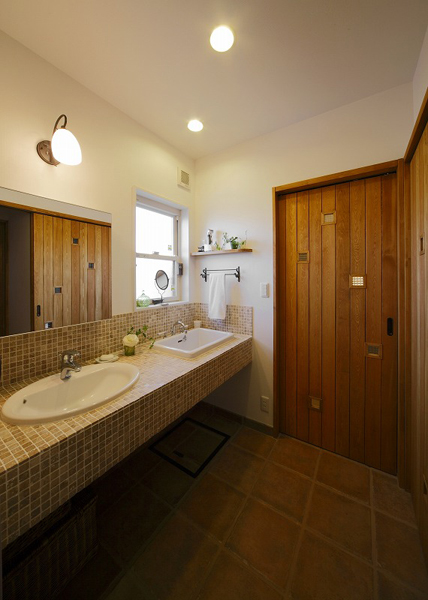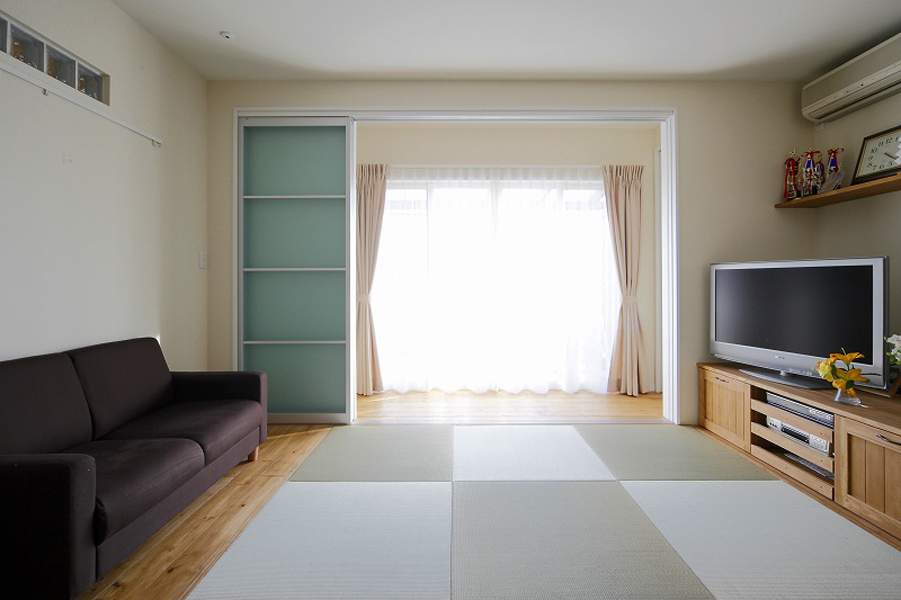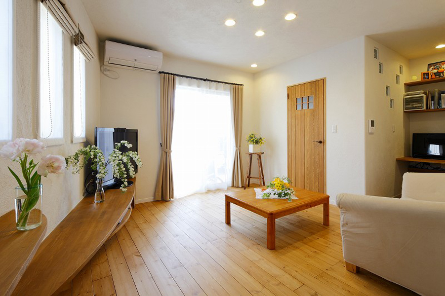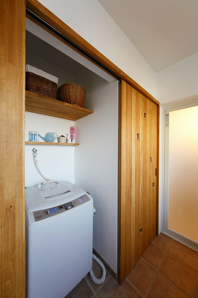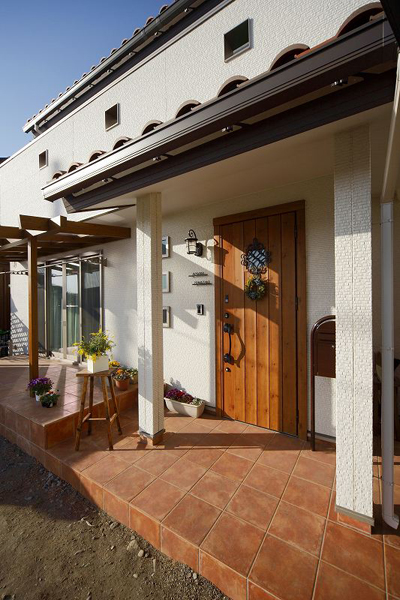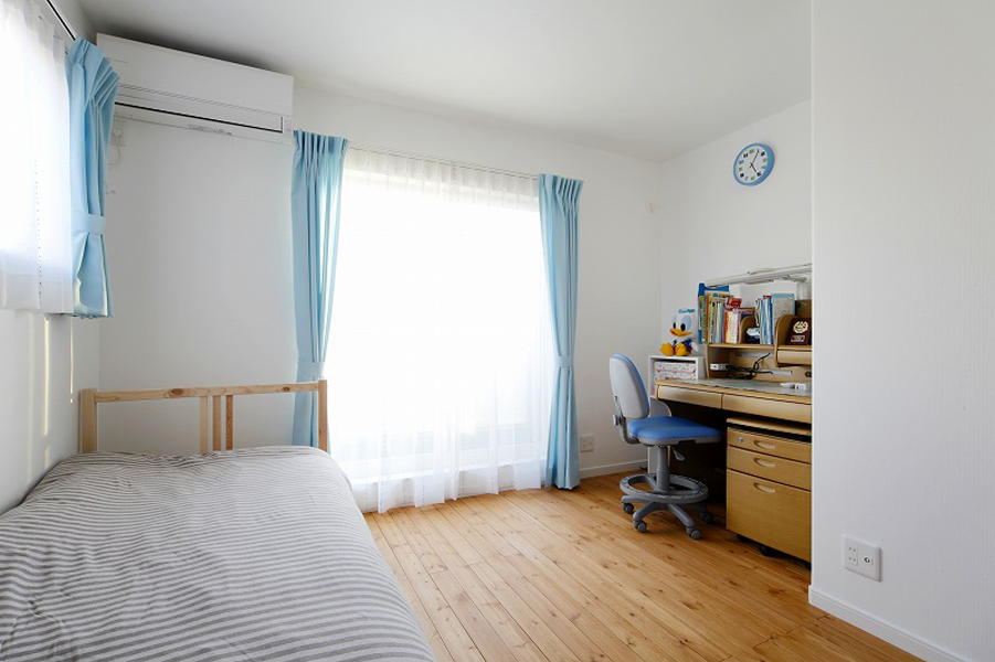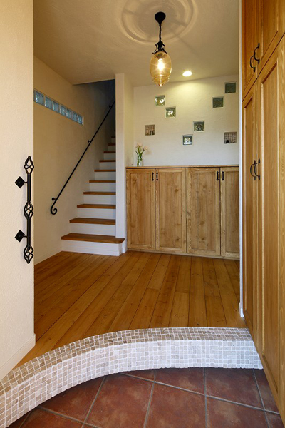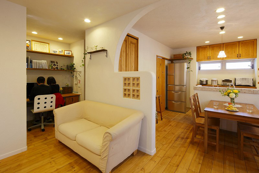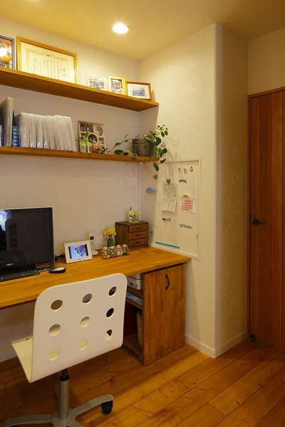 少しくぼんだスペースには、ゆったりしたPCコーナーを配置。半個室小部屋の感覚で、落ち着く場所になっています。家族の本棚も設置し、デスク廻りはすっきり。玄関には伸びゆく木をイメージしてガラスブロックを配置。ドアを開けたら個性的な表情で出迎えてくれます。また、リフォームを通して子供達がお家に興味と愛着をお持ちになり、新しい自分の部屋を喜んでくれているそうです。