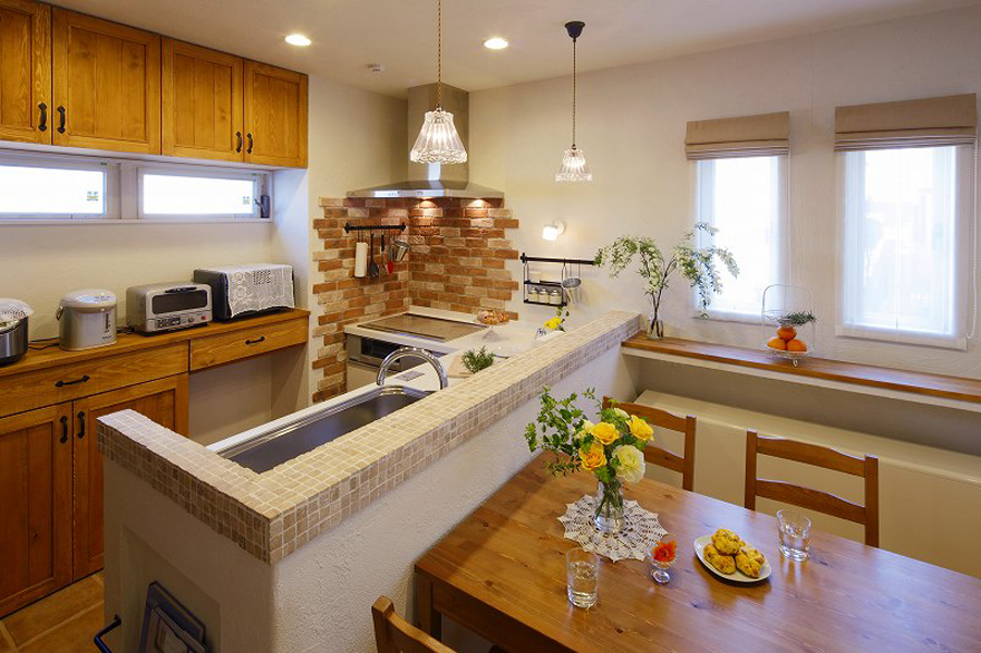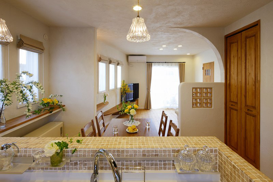 LDKは、斜めの形状の東側の壁のラインと曲線を取り入れたデザインに。Rをきかせた棚板は躍動感溢れるバランスで設置しました。リビングとダイニングのアクセントとしての間仕切りにもR形状を取り入れ、横方向だけでなく縦方向に伸びる躍動感を取り入れています。空間に立つと動きを感じおもしろい。