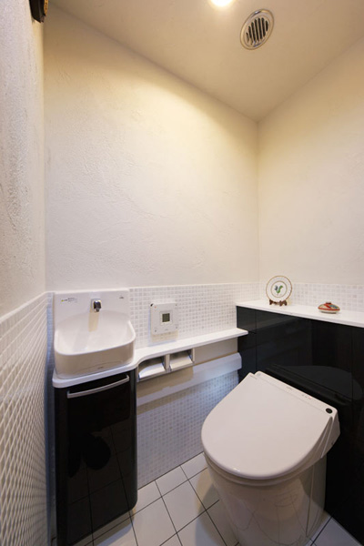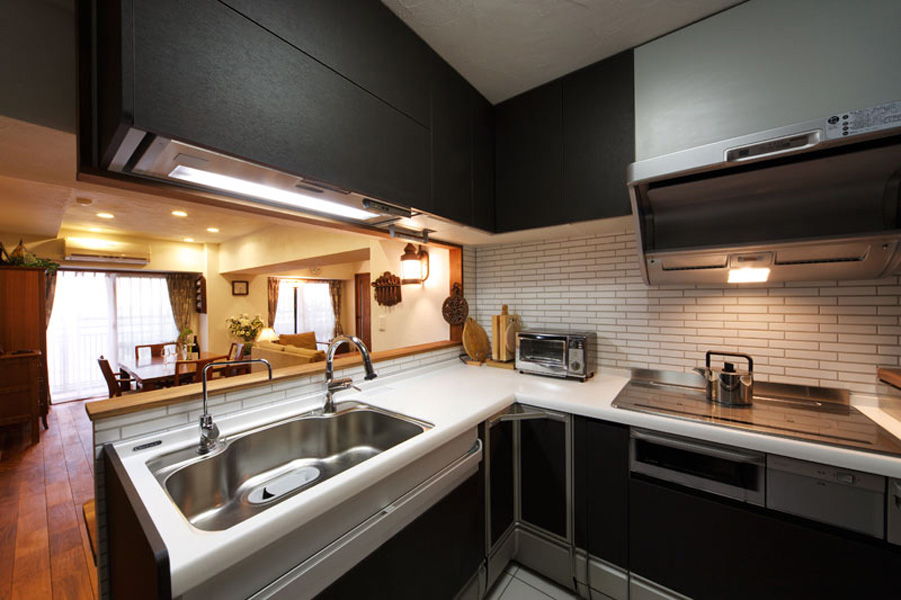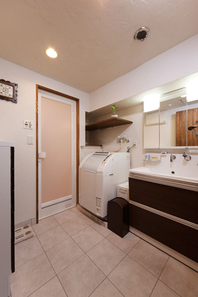 壁・天井は全て珪藻土を使用し、水廻りの床には全てタイルを使用。キッチンは対面にして、限られたスペースに収納を多く取り込みました。