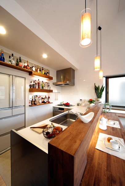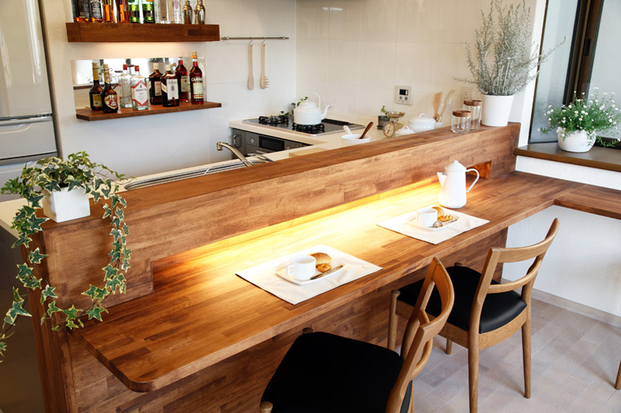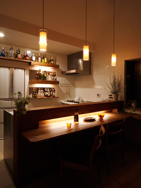 ご夫婦で仲良くお酒を飲むことが多く、会話も雰囲気も楽しめるバーのようなキッチンにするため、落ち着いたウォールナット色にし、間接照明をつかい、手元やカクテルの瓶を照らす照明をつけ、ダイニングキッチンの用途としての照明と切り替えが出来るようになりました。