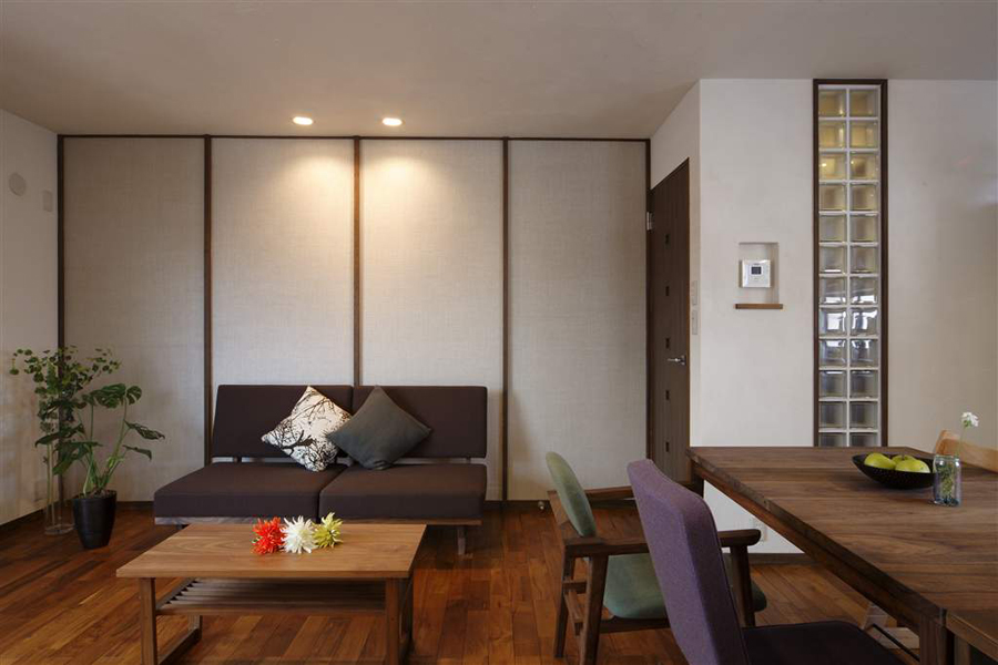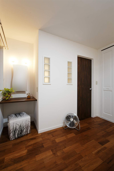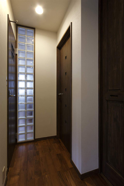 暗い廊下へ採光の為、ガラスブロックを設置。真空部分は音漏れ対策になっています。