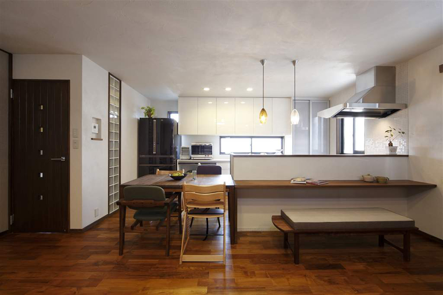 余分な廊下スペースはLDKに取り込み、閉鎖的な間仕切壁を取り払いオープンキッチン風の対面式に。対面カウンターは、奥様が料理中にもお子様が宿題などを出来る、低めで安心な高さ。夜になるとバーカウンターに変身します。