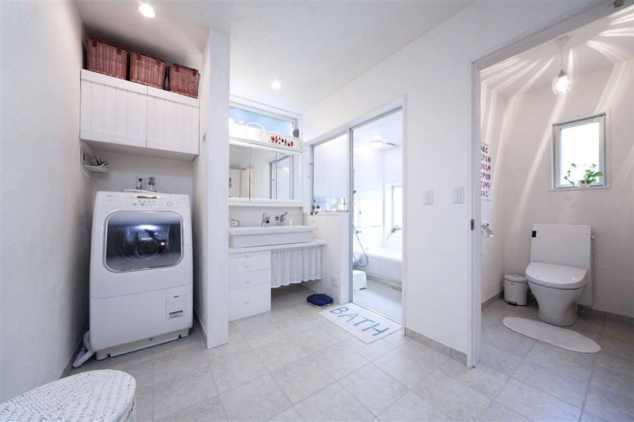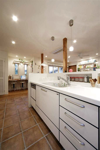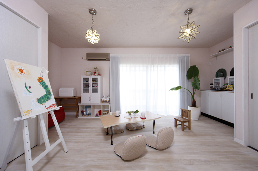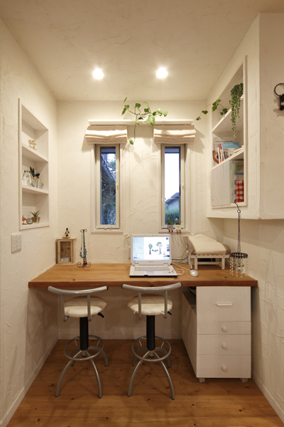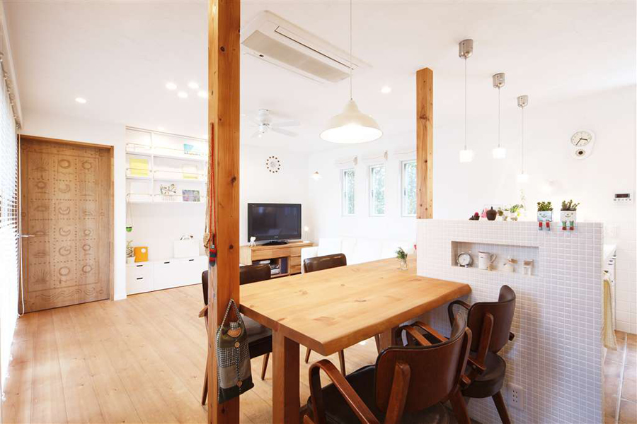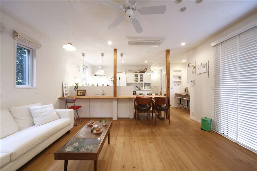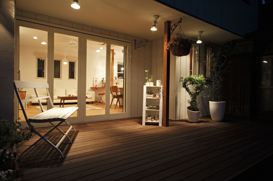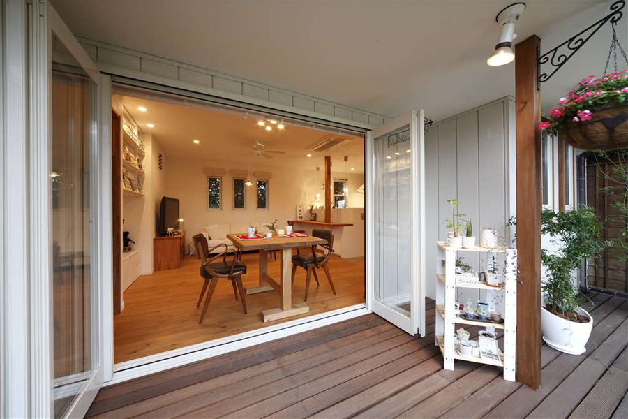 御結婚を機にご主人様の実家の離れをリフォーム。保母さんをしている奥様は、将来生まれてくる子供達が喜ぶ広いLDKにし、白を基調に好みのインテリアで楽しくまとめてほしいとのご要望でした。広々としたLDKの中心となるキッチンカウンターと繋がるテーブルは、動かすことができ、デッキに向けて配置し、家族と食の時間を楽しむことも出来ます。室内インテリアの白をデッキや外観にも取り入れて爽やかな印象に。玄関のアプローチは曲線を使うことにより優しくアプローチ。花や観葉植物などの育みを、子供達と朝も昼も夜も楽しめる空間を作りました。