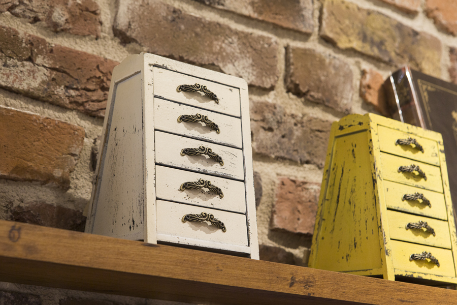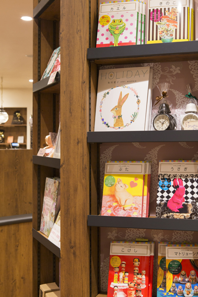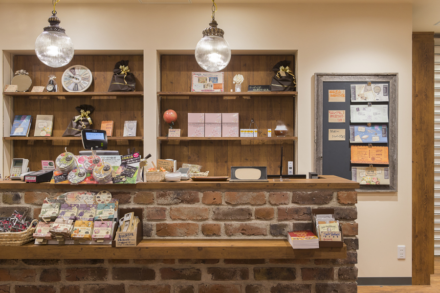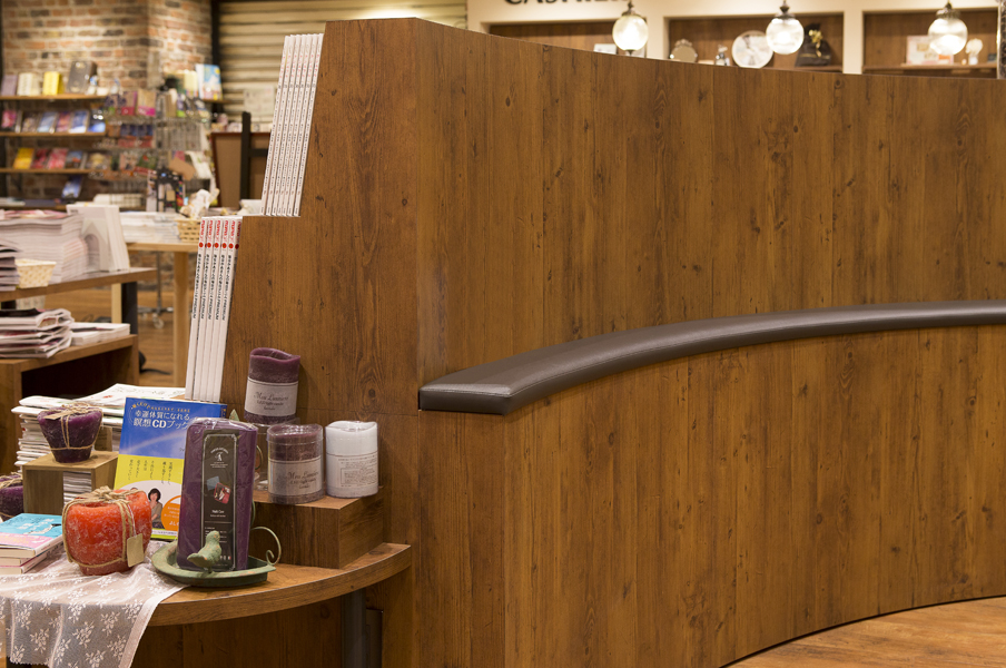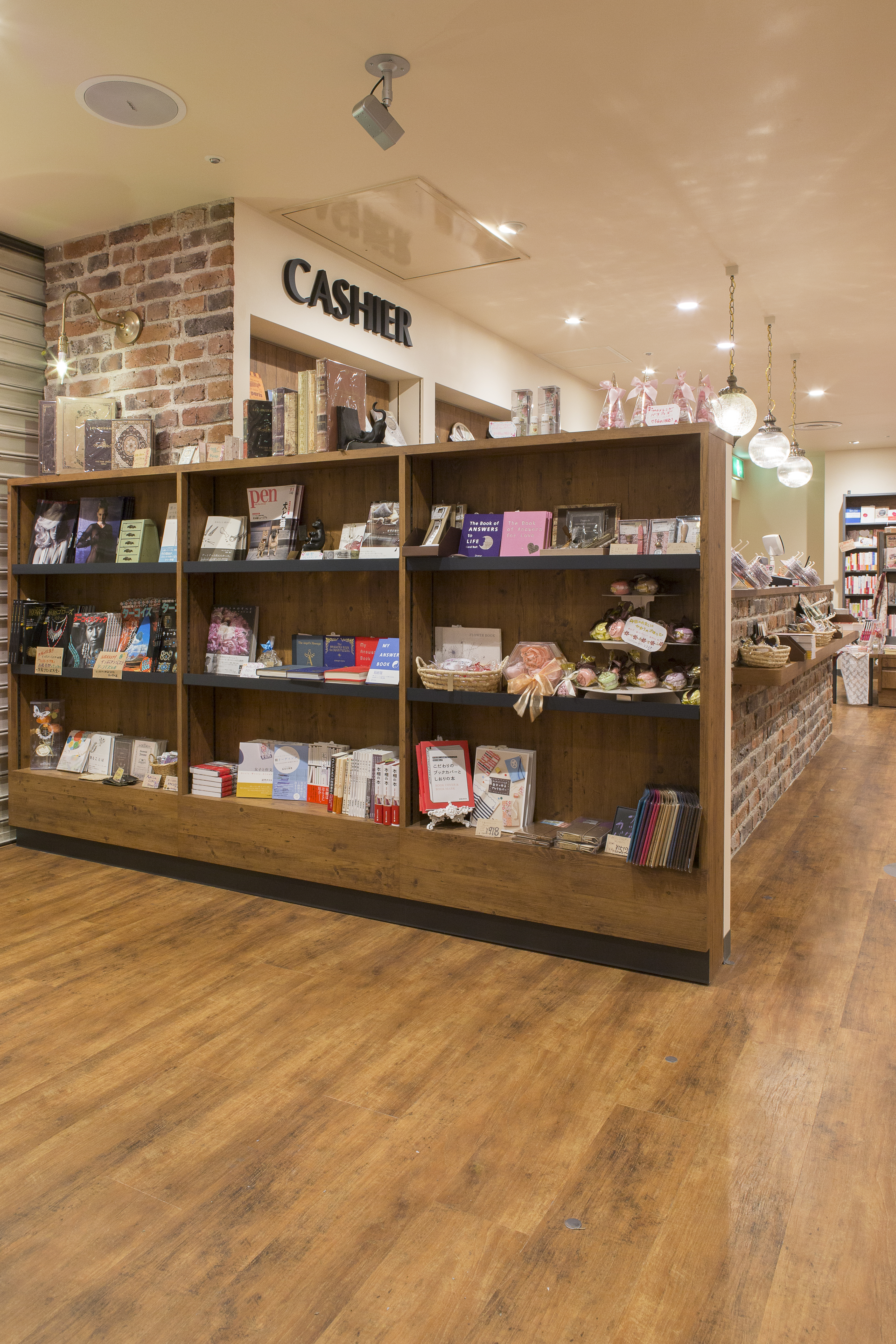 既成の書棚を利用し、書店としての陳列のしやすさを追求するのはもちろん、女性のお客様が好み、既存書棚との調和を図れるよう、インテリアテイストは「シャビーシック」なイメージに。ショップのイメージカラーである、ピンクのフェミニンな英国製壁紙を貼った棚や、アンティークブリックやアイアン棚受けなどを採用。一般的な本屋さんの印象を感じさせない、趣のある柔らかなインテリアに仕上げました。