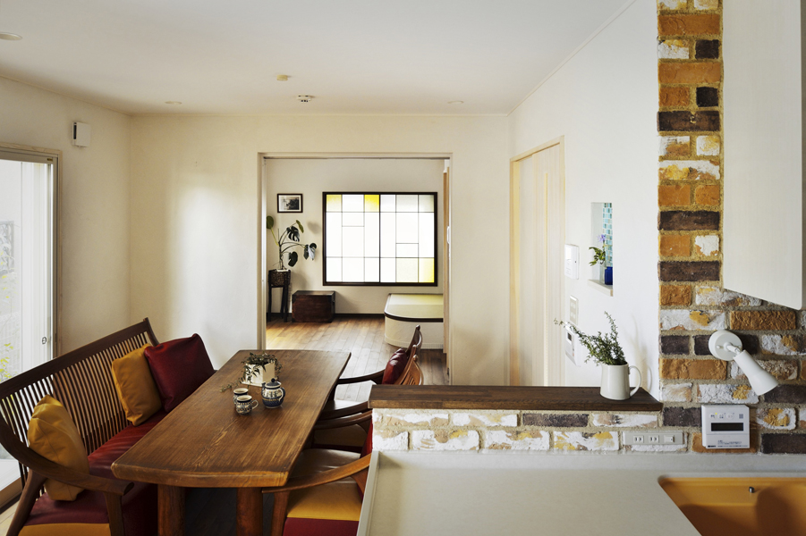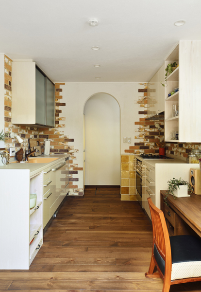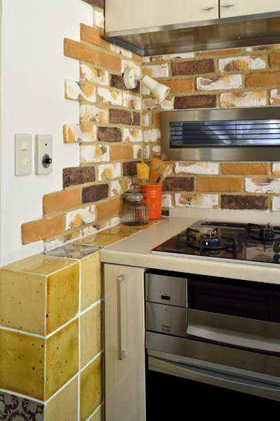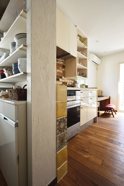 壁面には色とりどりのブリックタイル。調味料置き場にはおしゃれなデザインタイルをあしらっています。実はこの調味料置き場は、ご友人から好評を博すご自慢のポイントのひとつ。「生活に彩りを添えるエッセンスの1つ」とご満足を戴いています。