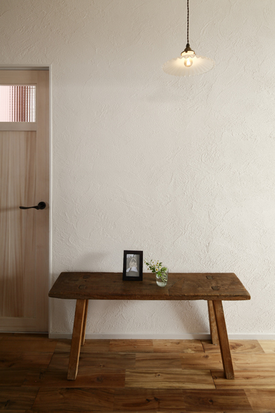 床アカシア無垢材のフローリング 美しい木目が特徴的 壁珪藻土を施工 コテを使った塗り跡で、ナチュラルなイメージに